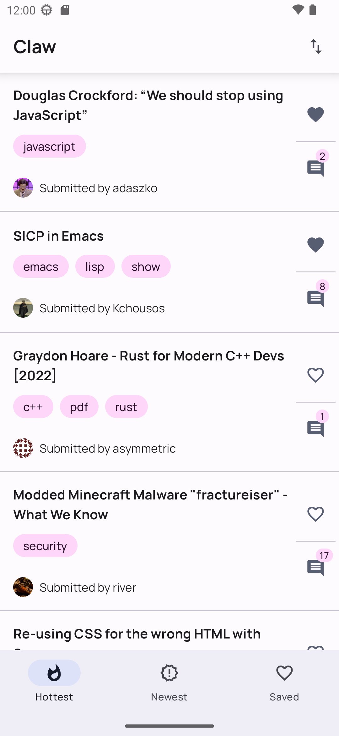 Claw เป็นไคลเอนต์แบบอ่านอย่างเดียวอย่างไม่เป็นทางการสำหรับ https://lobste.rs link aggregator ที่รองรับการบันทึกโพสต์ ซึ่งช่วยให้เพิ่มเป็นสองเท่าของรายการเรื่องรออ่าน