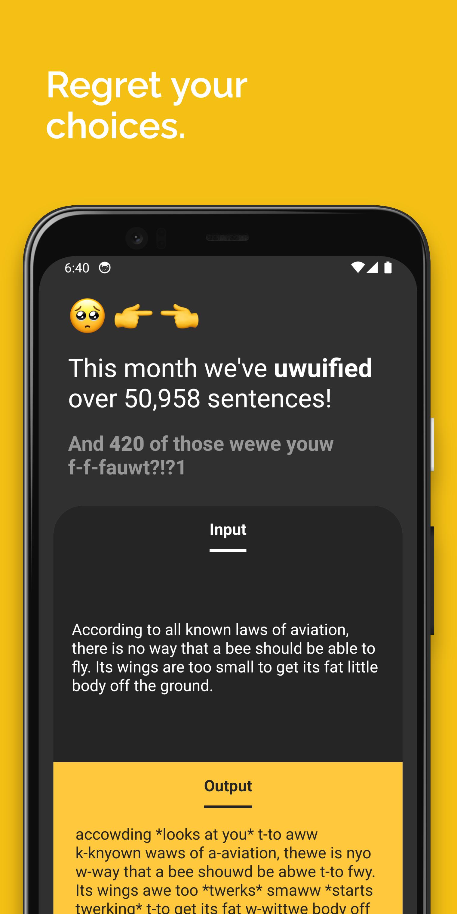 ค้นพบสุดยอดแอปสำหรับการแปลงข้อความ uwu, owo และอนิเมะทั้งหมดของคุณ! Uwuifier หรือที่รู้จักในชื่อนักแปล Owoifier โดดเด่นในฐานะเครื่องมือสร้าง uwu และ owo ที่ซับซ้อนที่สุดบนเว็บ ดำดิ่งสู่ความสามารถอันน่ารื่นรมย์: แปลข้อความ ประโยค หรือคำศัพท์ใดๆ (ยกเว้น URL และการกล่าวถึง @) และเพลิดเพลินไปกับวลีน่ารัก การพูดติดอ่าง และใบหน้าที่แสดงออกถึงความน่ารักมากมายเหลือเฟือเพื่อเติมความสนุกสนานให้กับการสนทนาของคุณ!