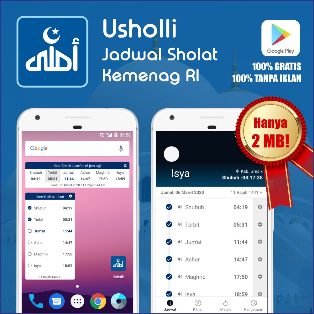 ขอขอบคุณที่ใช้ Usholli โปรดแบ่งปัน Usholli กับครอบครัว เพื่อน และญาติพี่น้องของคุณทั่วประเทศอินโดนีเซีย เพื่อให้ Usholli นำมาซึ่งประโยชน์มากยิ่งขึ้น และด้วยพระประสงค์ของพระเจ้า ขอให้ Usholli กลายเป็นกุศลผลบุญที่ยั่งยืนสำหรับเราทุกคน อาเมน โอ้พระผู้เป็นเจ้าแห่งสากลโลก