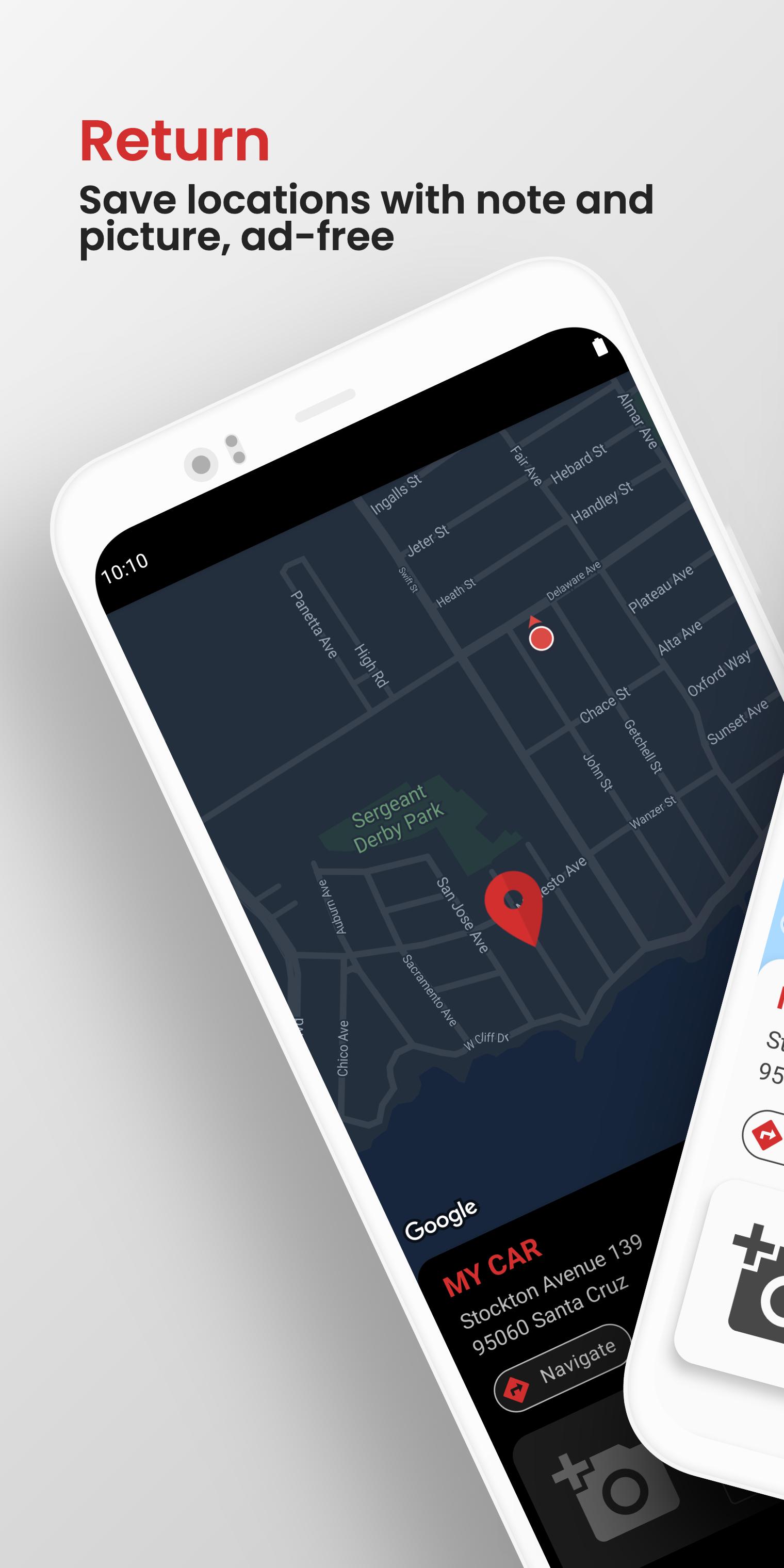 แอป Return ช่วยให้คุณหาทางกลับไปยังตำแหน่งที่คุณบันทึกไว้ อาจจะเป็นตำแหน่งรถของคุณในเมืองใหญ่หรือแค่สถานที่สำหรับพบปะเพื่อนฝูงในภายหลังซึ่งสามารถแชร์ได้ด้วย เนื่องจากอินเทอร์เฟซผู้ใช้ที่สะอาดและใช้งานง่ายแอปจึงใช้งานง่ายมาก เพียงกดเครื่องหมายที่ด้านล่างเพื่อบันทึกตำแหน่งปัจจุบันของคุณและตั้งชื่อ คุณสามารถเพิ่มบันทึกย่อและรูปภาพไปยังตำแหน่งที่บันทึกไว้