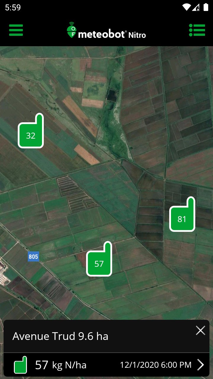 บนพื้นฐานของปริมาณคลอโรฟิลล์ปริมาณน้ำฝนความชื้นในดินอุณหภูมิของดินอุณหภูมิของอากาศชนิดและเนื้อหาของดินการพยากรณ์อากาศและพันธุ์ข้าวสาลีคุณจะได้รับคำแนะนำปุ๋ยไนโตรเจนที่กำหนดเองจากแอพมือถือMeteobot® Nitro