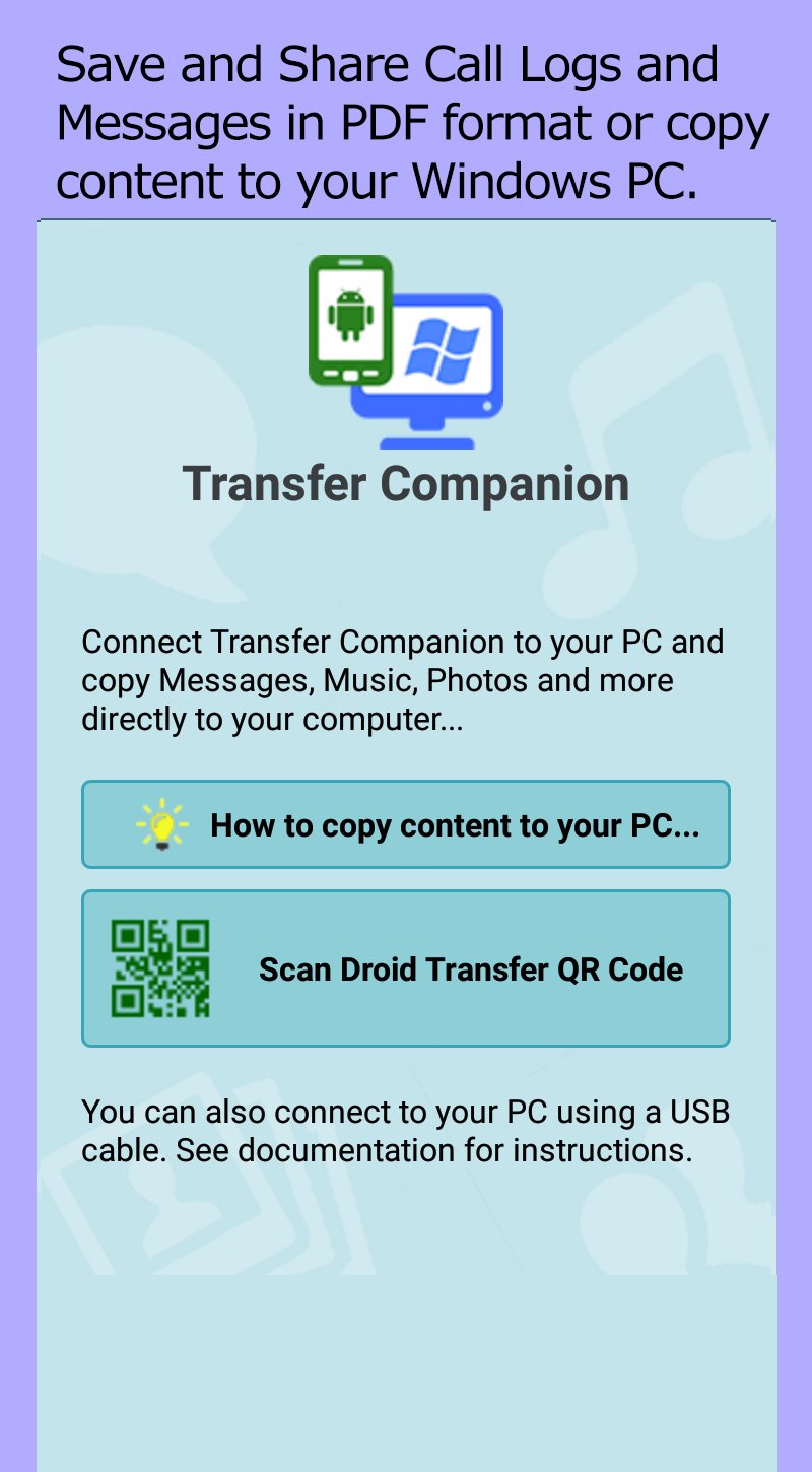 Transfer Companion provides additional functionality when used with PC Application "Droid Transfer". Using Transfer Companion and Droid Transfer together - you can backup messages, music, photos and other files on your Android Phone. Communication between your PC and your phone is completely local either over a Wi-Fi or a USB connection, and no information is stored, uploaded to the Cloud, or transmitted to a third party.