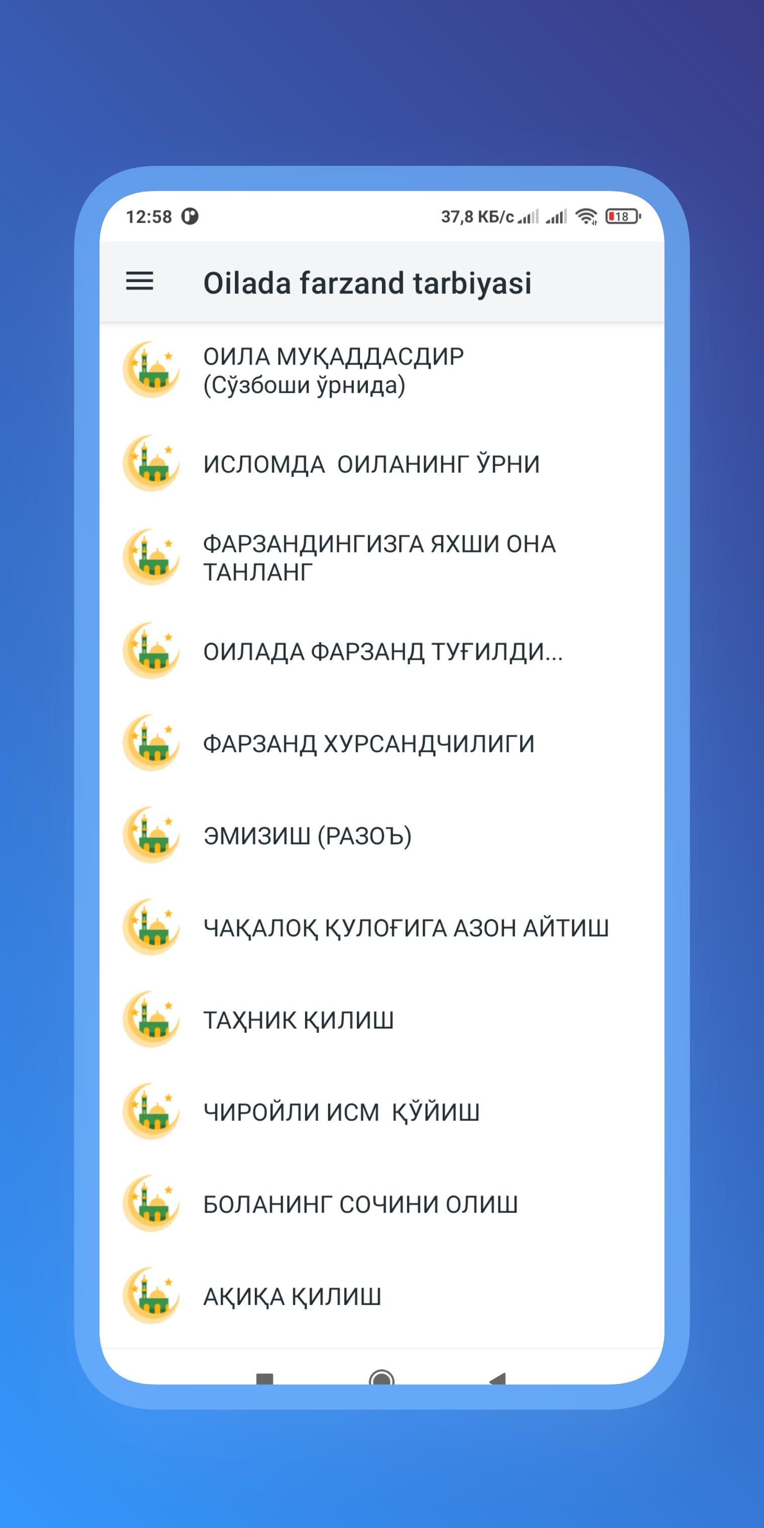 Islomiy dasturlar geliştiricisinden gelen Оилада фарзанд тарбияси, geçmişte Android systerm üzerinde çalışıyor.