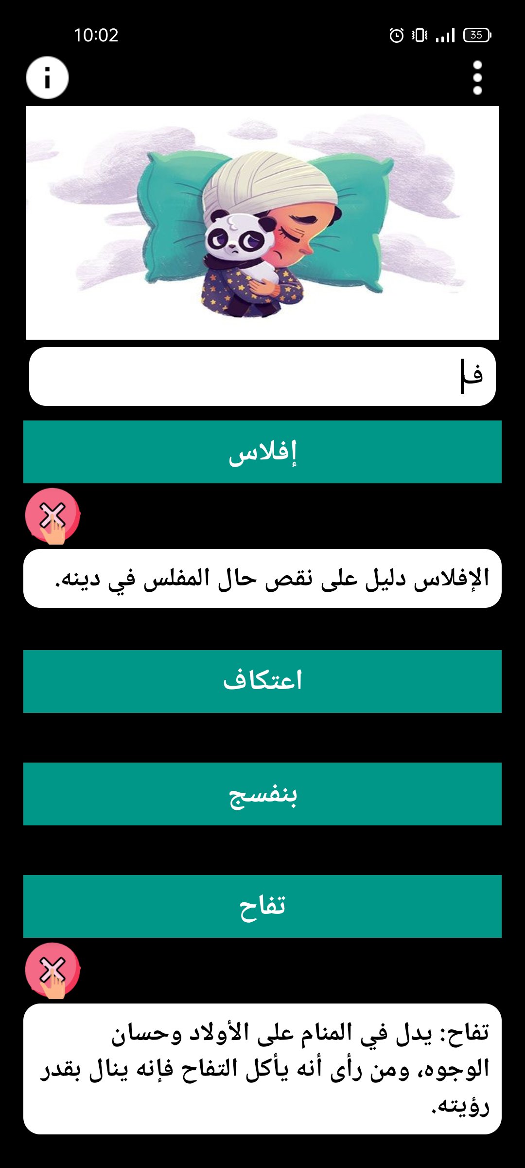Nabulsi'nin yorumuna ve Nabulsi'nin derslerine ve Shaarawy ve Sahih Muslim ve tefsir ahlam ibn sirine'nin yorumlanmasına dayanarak İslam'da rüyaların yorumlanması kurallarının bir sözlüğünü içeren bir uygulamadır.