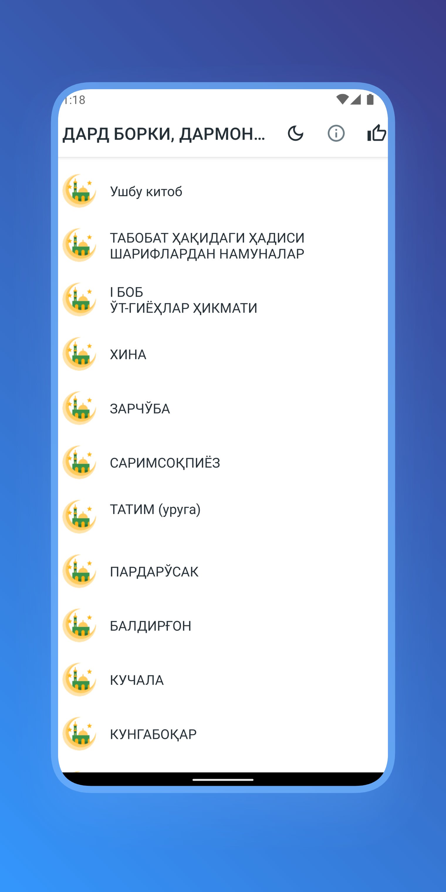 Islomiy dasturlar geliştiricisinden gelen Дард борки, дармон бор-1 китоб, geçmişte Android systerm üzerinde çalışıyor.