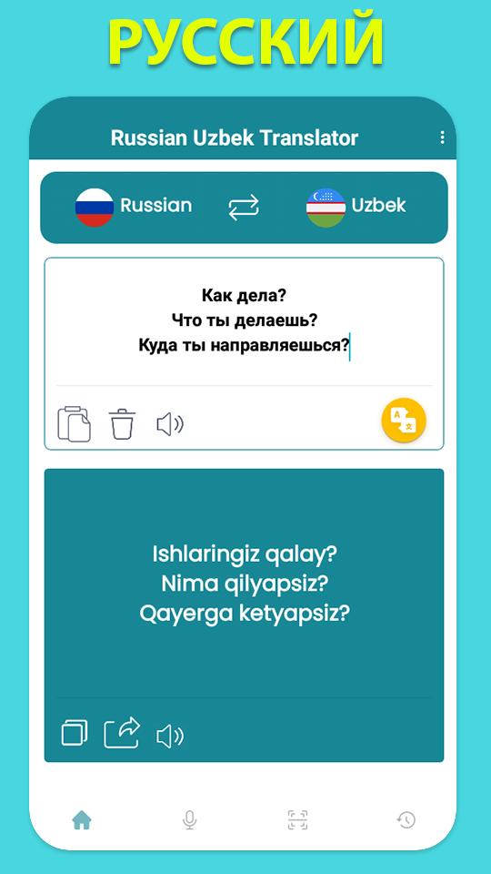 * Bu çeviri uygulaması tamamen ücretsizdir. Kelimeleri ve cümleleri Rusçadan Özbekçeye ve Özbekçeden Rusçaya her iki şekilde de çevirebilirsiniz. Bu kullanışlı çeviri uygulaması hızlı ve doğru çeviriler sunar.