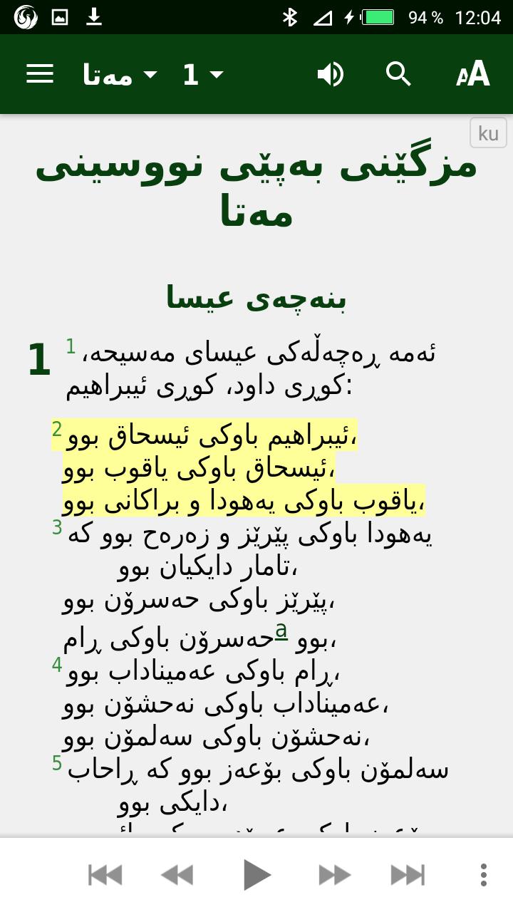 - "Ayet ayet" Kürtçe bir ayeti ve ardından aynı ayeti İngilizce veya Farsça Farsça veya Arapça olarak görüntülemek için.