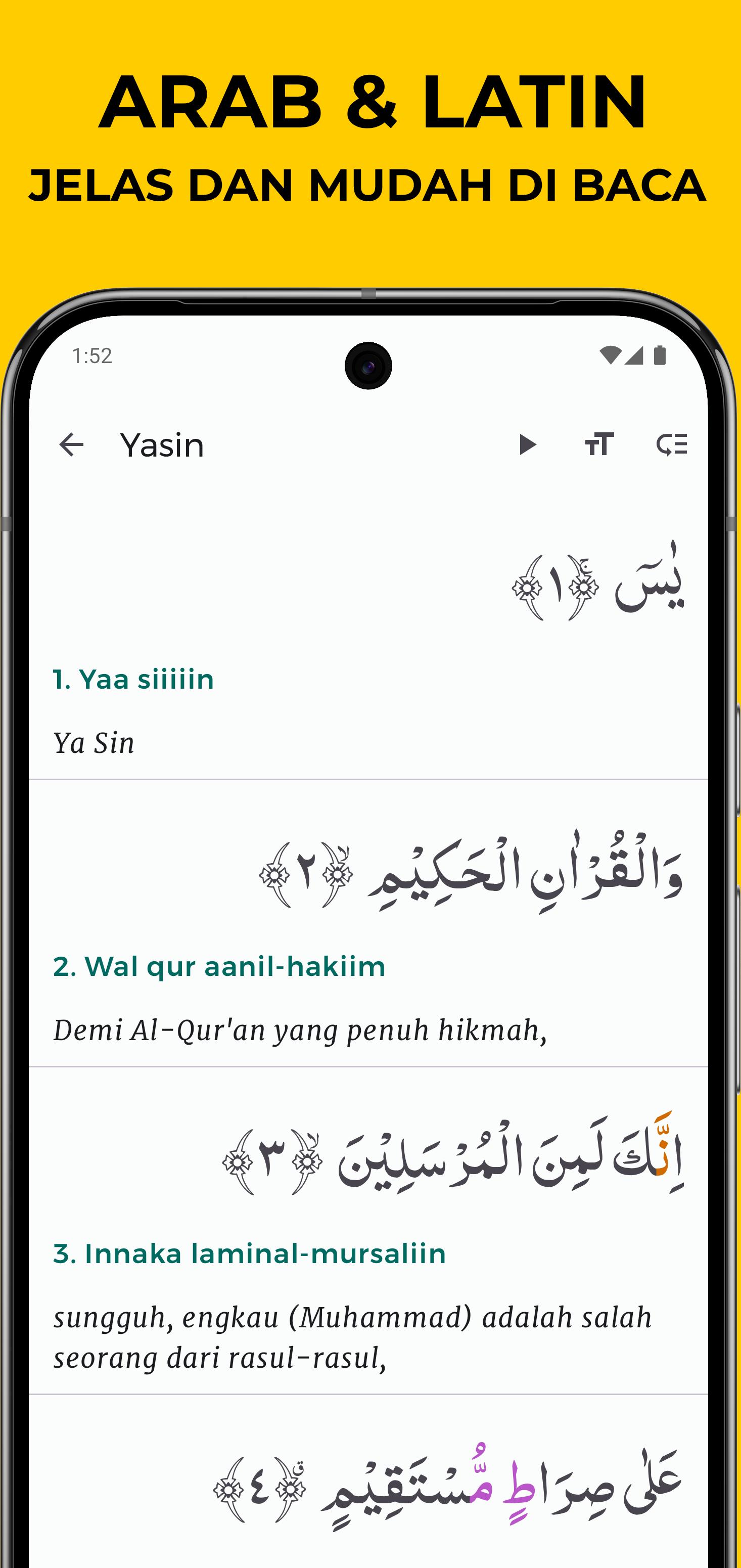Metin ve Çeviri: Bu uygulama Yasin Suresi metnini Arapça, Latince ve Endonezce çeviriyle sunarak kullanıcıların mektubun içeriğini okumasını ve anlamasını kolaylaştırır.
