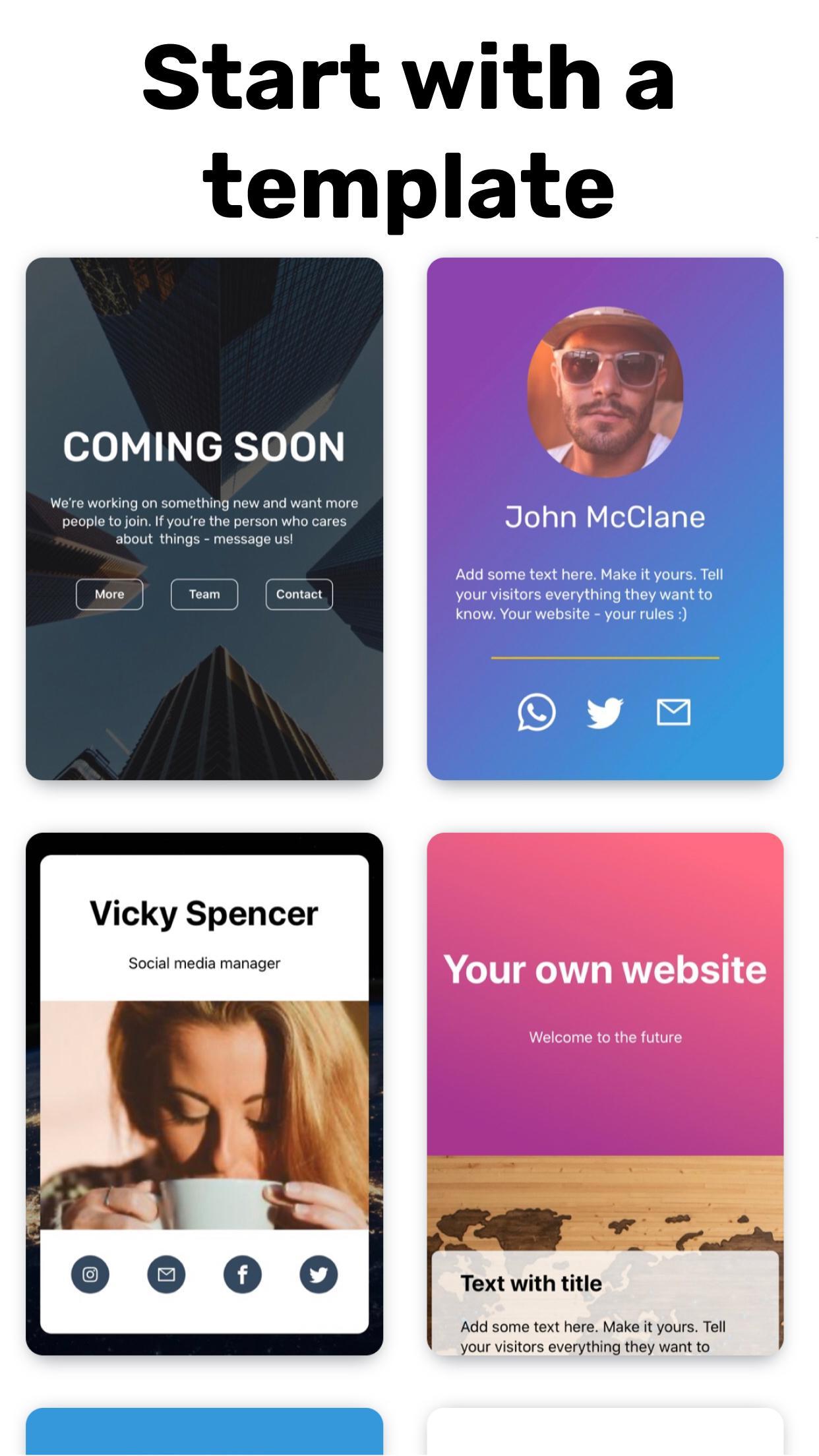 Easily create responsive website for your project or personal blog. Pick template and customize the design however you want. No coding required. You don't need to learn html, css or javascript. Build your website in our visual editor.