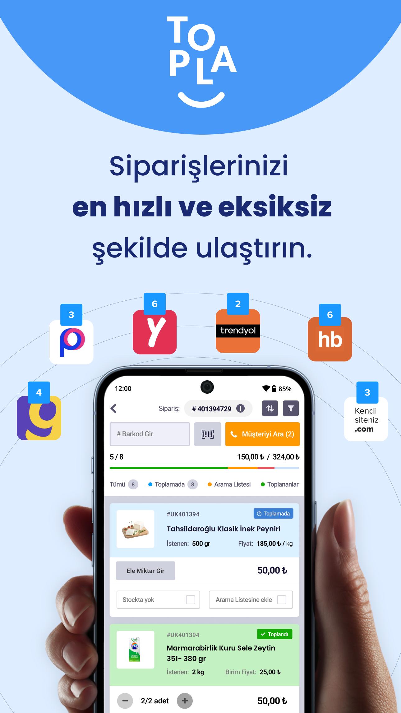 E-Ticaret kanalınızın en kritik oyuncusu hazır: topla.io, siparişlerinizin hızlı ve hatasız bir şekilde işlenmesinden takip edilmesi, ciro raporlamadan pazaryeri entegrasyonuna kadar, eksiksiz bir platformdur. Uzun yıllara dayanan sektörel deneyimimizle, topla.io'yu pratik ve akıcı kullanıma yönelik tasarladık. İsterseniz kasa sisteminizle otomatik fiş/e-fatura düzenleyebilirsiniz, isterseniz ERP sisteminizde e-fatura olarak belgelendirebilirsiniz, isterseniz kurye firmalarıyla entegre çalışabilirsiniz. Çalışanın bazında toplama performansı, teslim edilemeyen/denk ürün tercihleri dahil, toplama analitiğiyle, e-ticaret kanalınızı topla.io ile yönetin.