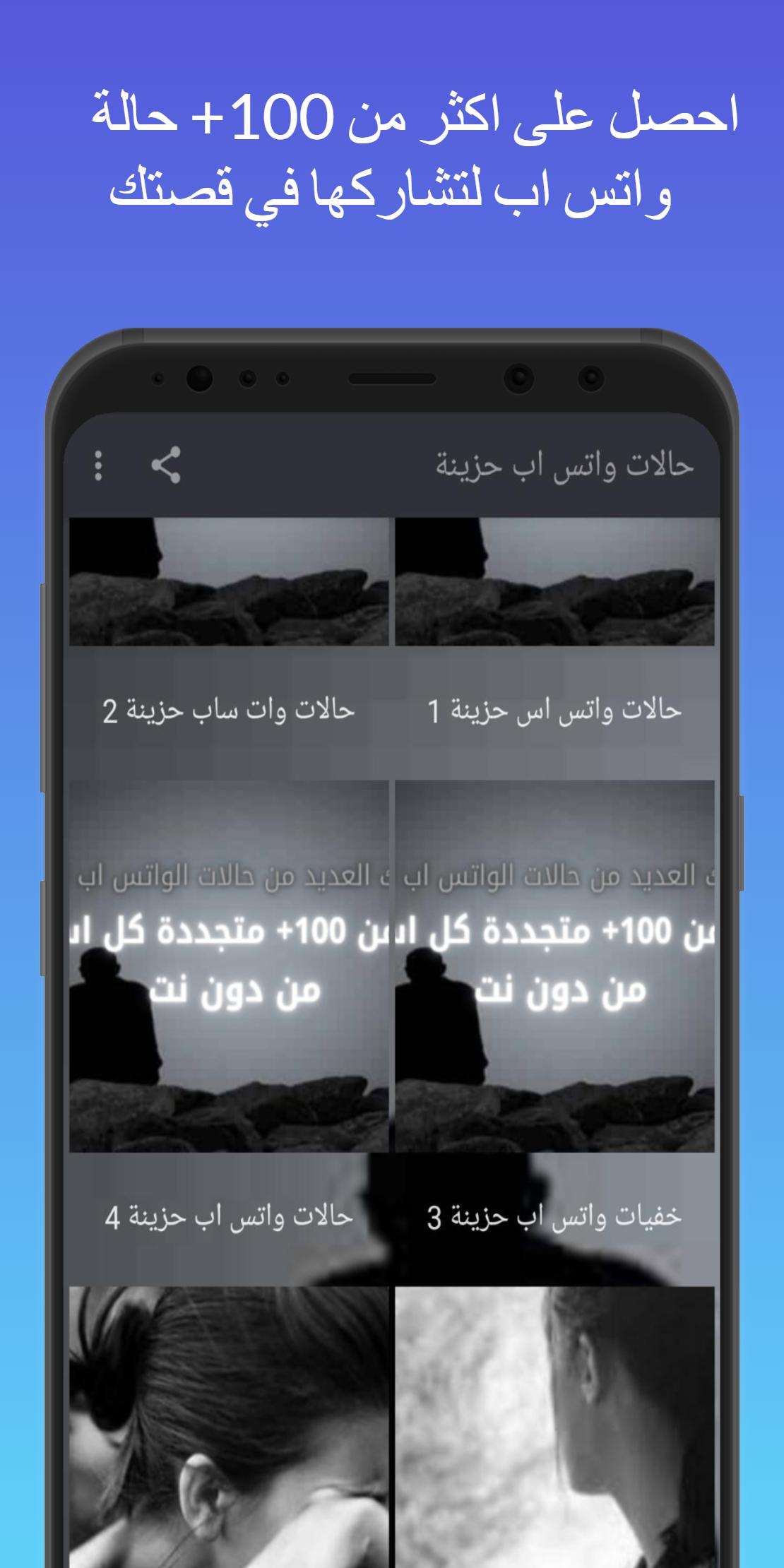 يقدم لك تطبيق حالات واتس اب حزينه اكثر من 100+ حالة من دون الحاجة الى الاتصال بالانترنت . كما يوفر تطبيق حالات واتس اب حزينه العديد من الحالات بجودة عالية جدا كي تتمكن من نشرها بين اصدقاءك وفي قصتك. كما ينفرد تطبيق حالات واتس اب حزينه بي توزيعه للحلات على اربعة اقسام لسهولة تصفحها وتحميلها والتعديل عليها . كما يقدم لك ايضا تطبيق حالات واتس اب حزينه شعر كتابيه حزين لتكتبه على صورك وقصتك . كما يوفر لك ايضا تطبيق حالات واتس اب حزينه العديد من الاقتباسات الحزينة . هذا ويقدم التطبيق كل هذه الامور بطريقة حديثه وسلسه ستنال على اعجابكم بكل تأكيد .