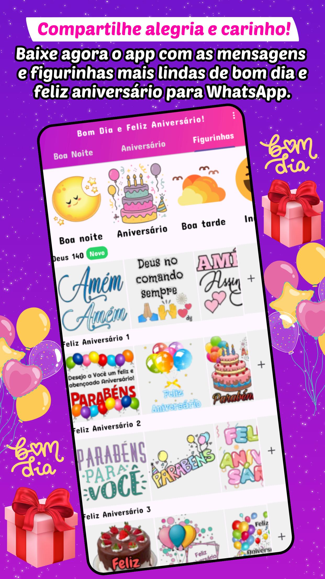 Figurinhas e Mensagens Bom Dia Tarde e Boa Noite geliştiricisinden gelen Bom Dia e Feliz Aniversário, geçmişte Android systerm üzerinde çalışıyor.