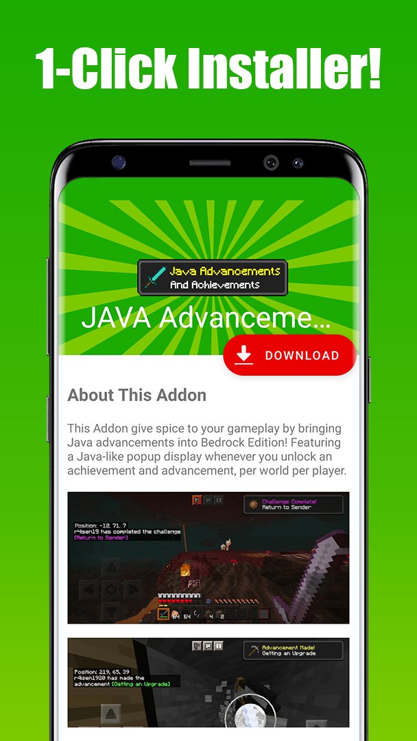 Java Advancements Mod for Minecraft PE, tamamen işlevsel bir Java AdvancementPack'i Minecraft Dünyanıza tek bir dokunuşla indirmenize ve yüklemenize izin veren bir uygulamadır!