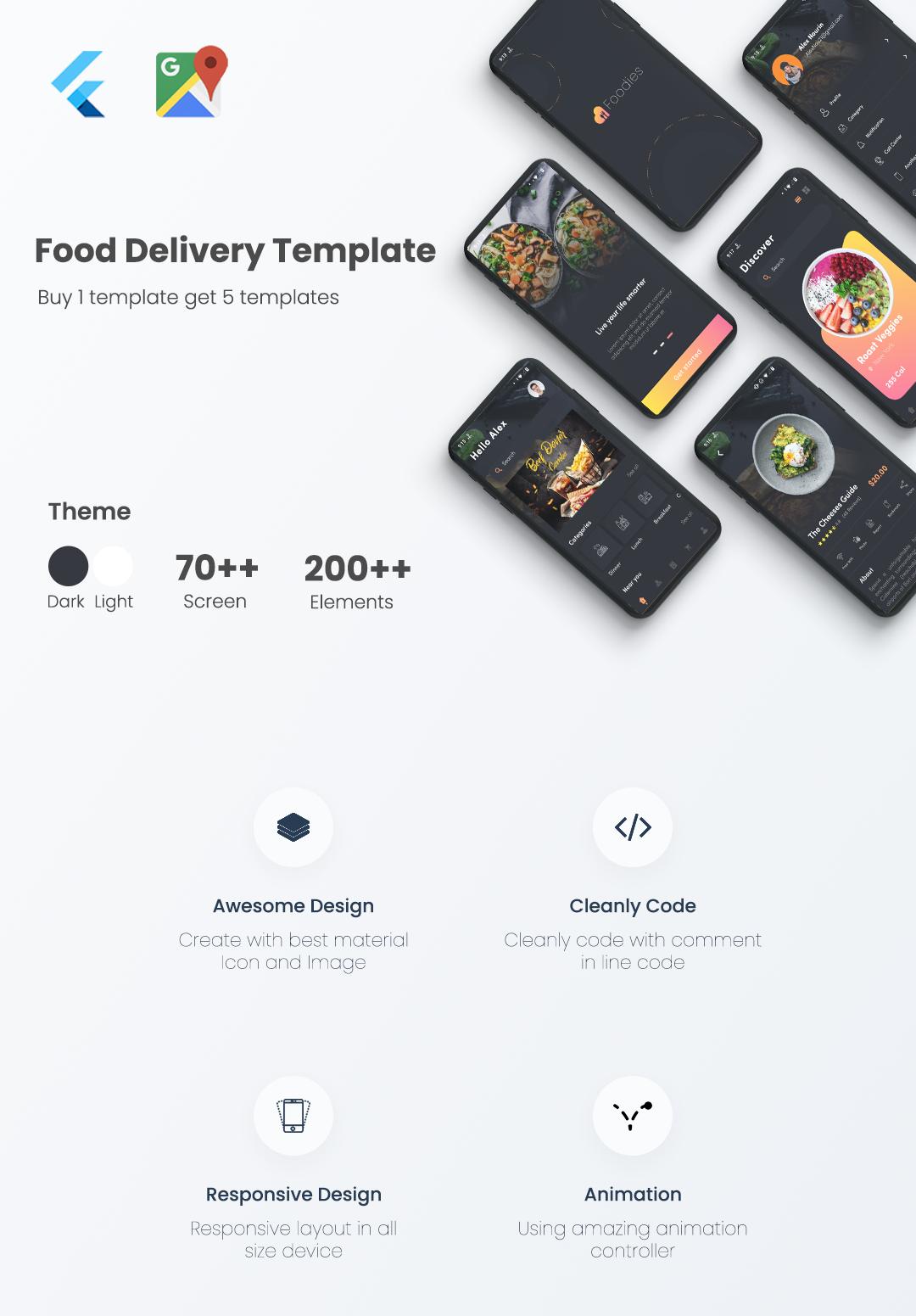 Food Delivery UI KIT using Flutter can be used for Food Delivery and Restaurant application for user interface kit in android and ios device, It contains 70++ Screens and 200++ elements with a different type of UI, Food Delivery, Foodie UI KIT can save your time to code all Front end layout.