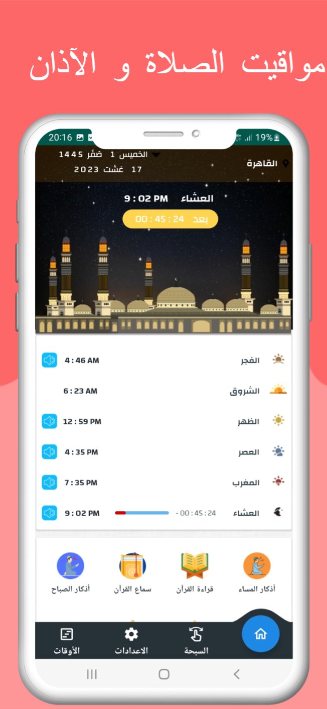 "Mısır'da namaz vakitleri", Krallık'taki Evkaf ve İslami İşler Bakanlığı'na göre doğru namaz vakitleri, sabah ve akşam hatıraları, Kur'an-ı Kerim'i işitme ve okuma, Hicri dahil olmak üzere birçok özelliği ve özelliği içeren basit bir uygulamadır. tarih, kıble, hac, oruç...