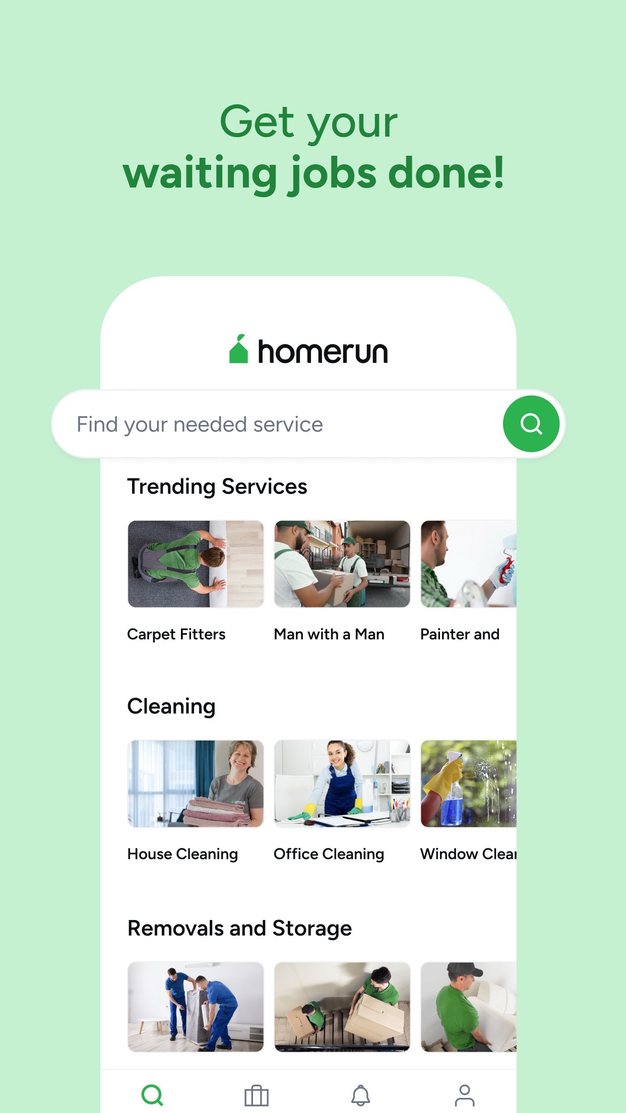 HomeRun, eviniz veya ofisiniz için bir temizlikçi bulmanızı, yeni evinizi taşıyacak bir taşıma şirketi bulmanızı, evinizi daha renkli hale getirecek boyacıları bulmanızı, evinizi daha iyi bir yer haline getirecek bir ev tadilat uzmanı bulmanızı vb. çok kolaylaştırır.