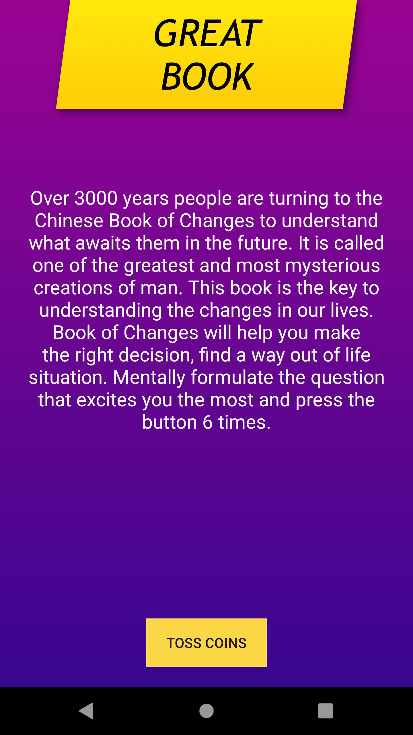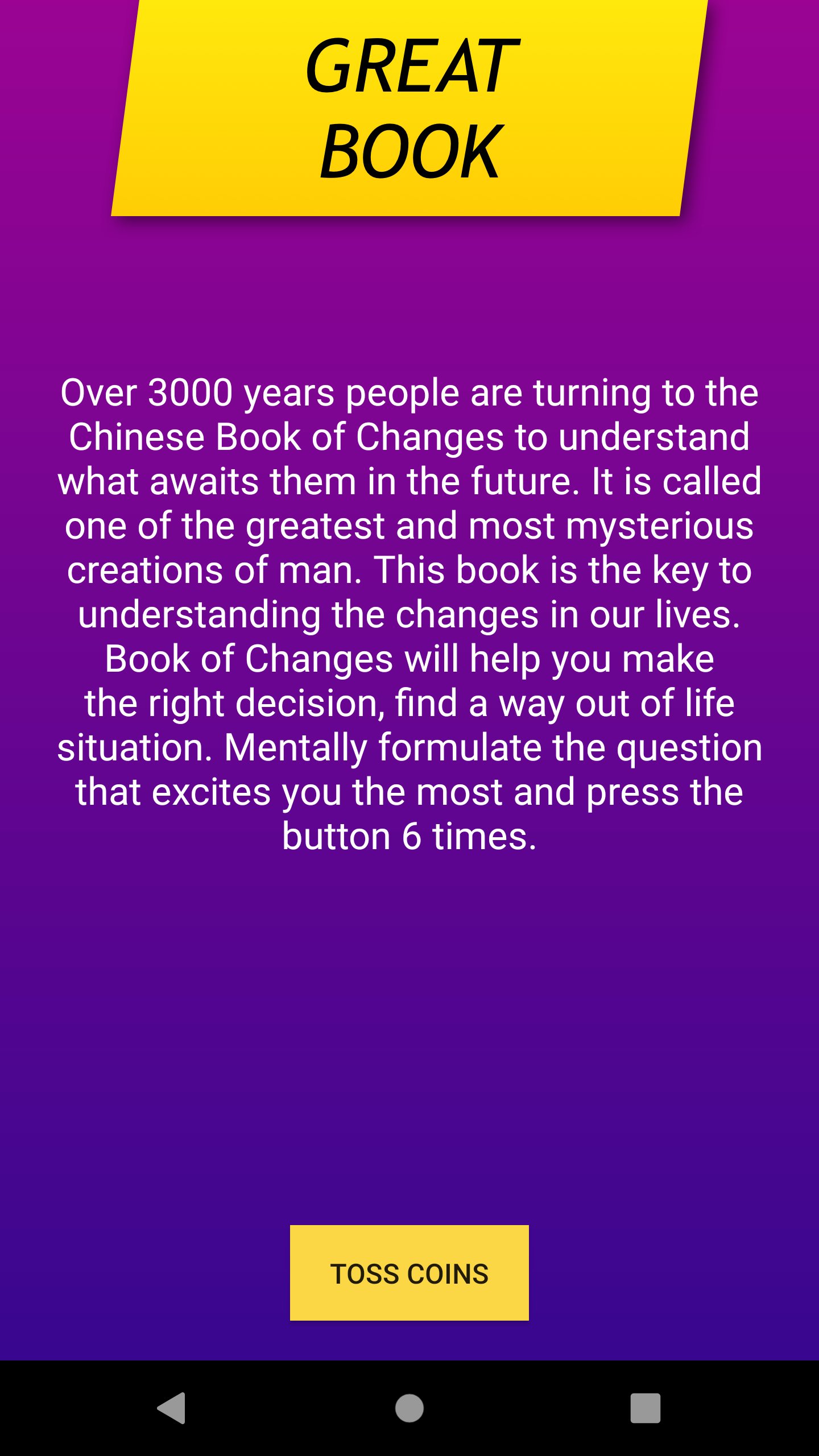 Incredible, but it works! Over 3000 years people are turning to the Chinese "Book of Changes I Ching" to understand what awaits them in the future. It is called one of the greatest and most mysterious creations of man. This book is the key to understanding the changes in our lives. "Book of Changes" will help you make the right decision, find a way out of life situation. I Ching is not just a fortune-telling on a hand or reading a horoscope. This is a collection of the experience and advice of the universe!