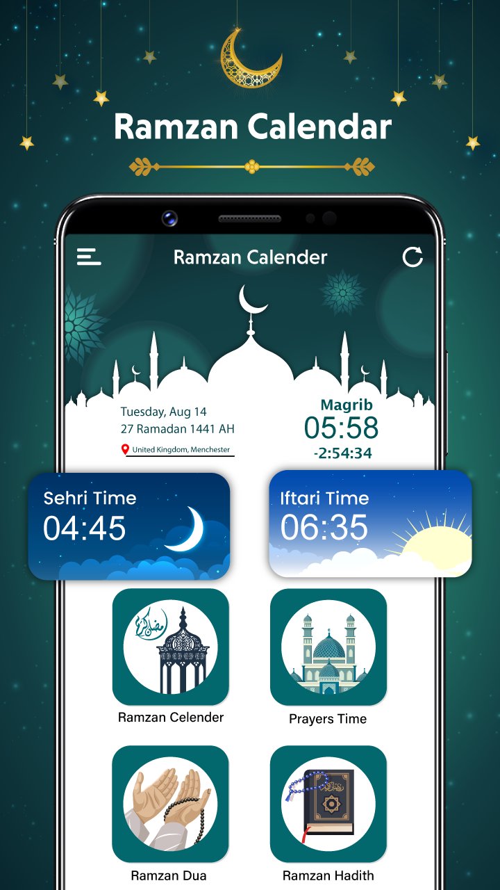 Ramazan Takvimi uygulaması Ramazan ayı boyunca günlük oruç süresini sağlar. Uygulamada Doğru iftar saati ve Sahur saati görüntülenecektir. Mevcut konumunuzu manuel olarak seçebilirsiniz.