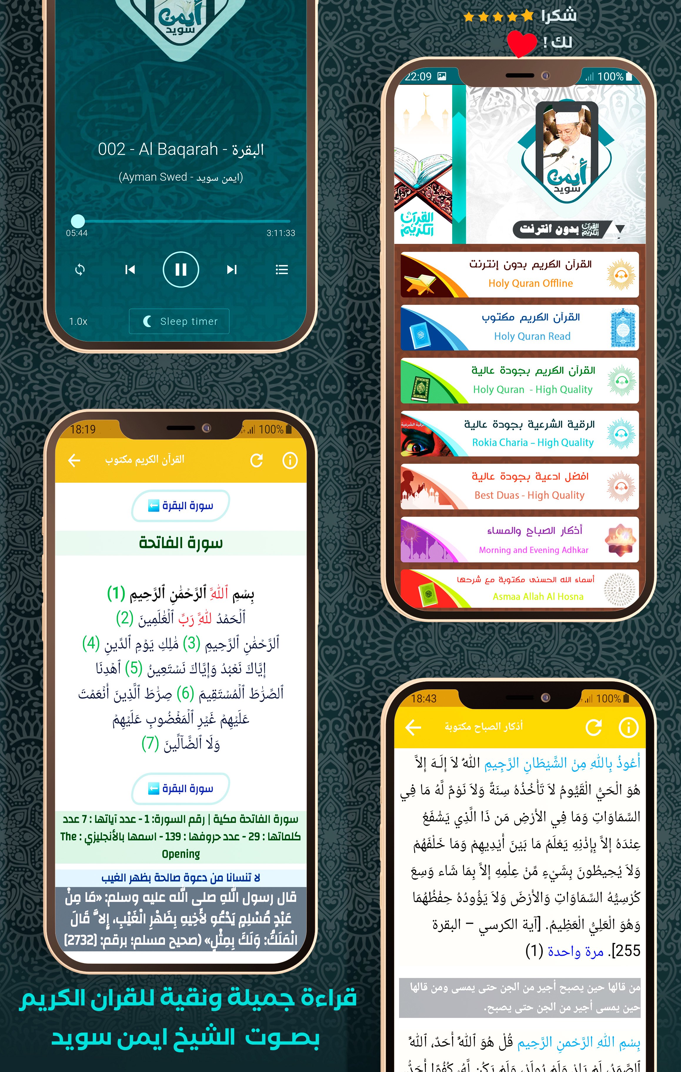 ⯌ Bu uygulamayı kolaylıkla kullanabilir ve ayrıca en ünlü okuyuculardan biri olan okuyucu Ayman Al-Suwaid'in sesinin tadını çıkararak Kur'an-ı Kerim'in surelerini okuyabilir ve dinleyebilirsiniz.