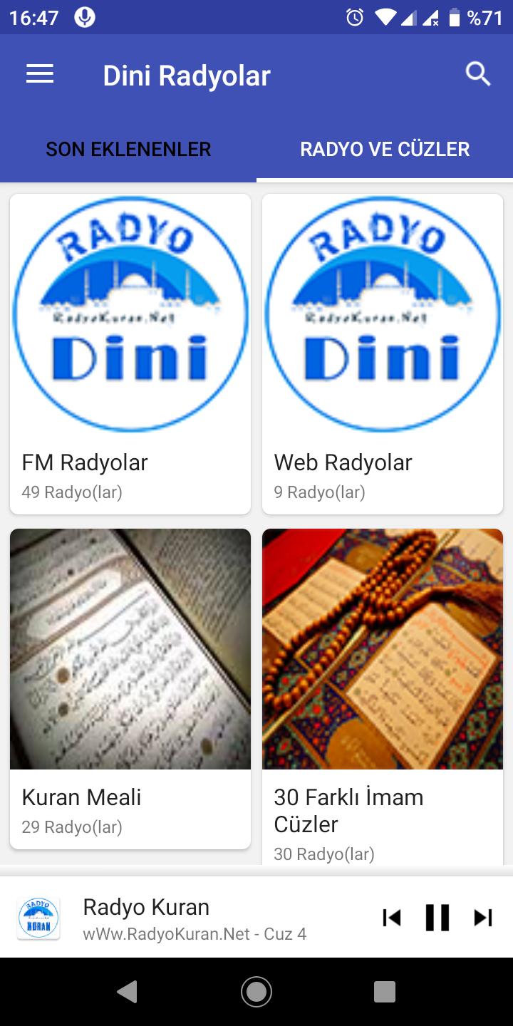 Uygulamamızda artık Kur'an meali ve cüzler de var. Dini Radyolar uygulaması ile Kur'an meali ve 30 farklı imamdan cüz dinleyebilirsiniz.