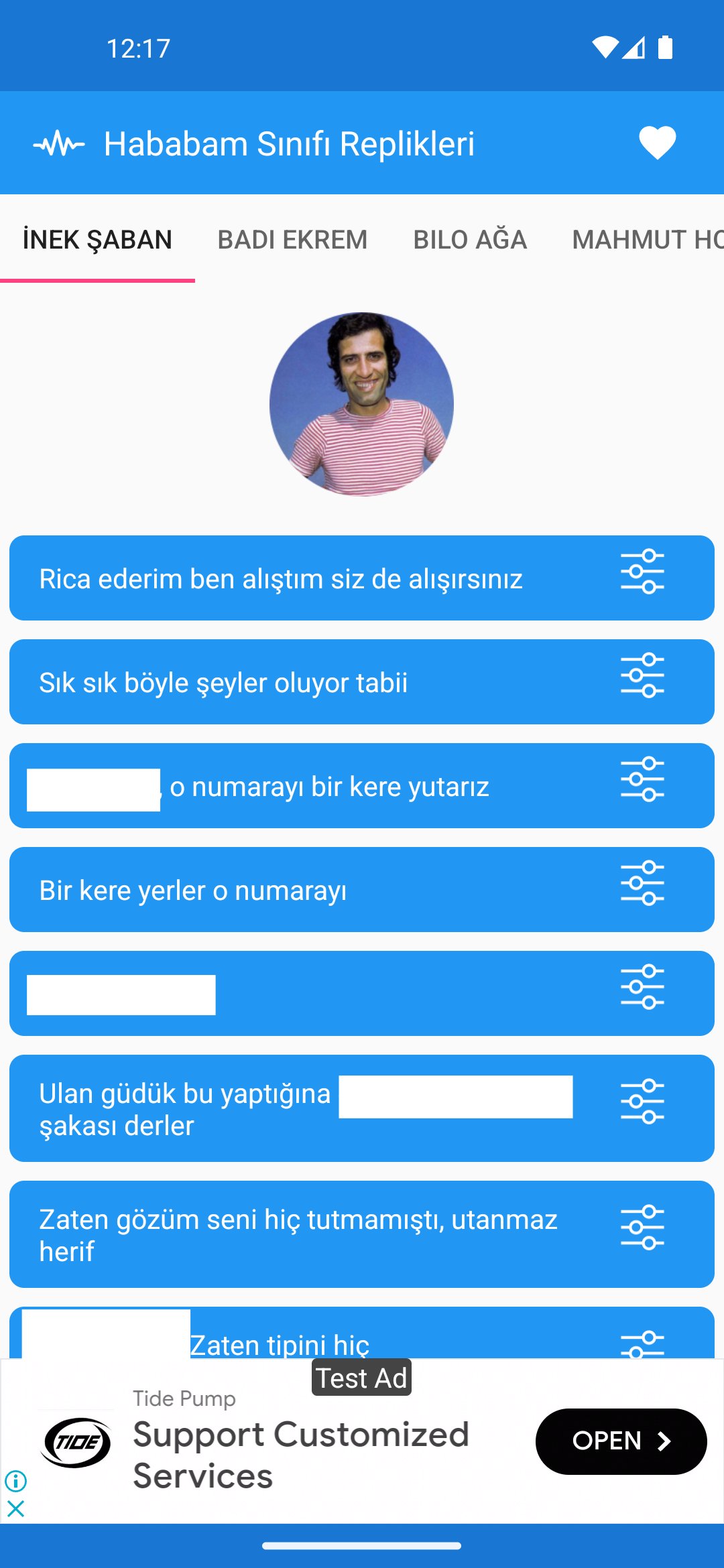 Hababam Sınıfının renkli karakterlerinden İnek Şaban, Güdük Necmi, Damat Ferit, Domdom Ali, Bozum Cahit, Tulum Hayri, Hayta İsmail, Mahmut Hoca, Badi Ekrem, Hürrem Hoca, Bilo Ağa, Hafize Ana, Ahmet, KülYutmaz, Paşa Nuri ve daha nicelerinin komik repliklerini dinleyebilir, arkadaşlarınızla paylaşabilir, zil sesi ve bildirim sesi olarak atayabilirsiniz. Yeşilçam'ın unutulmaz film serisi ve oyuncularının hepsi bir arada.