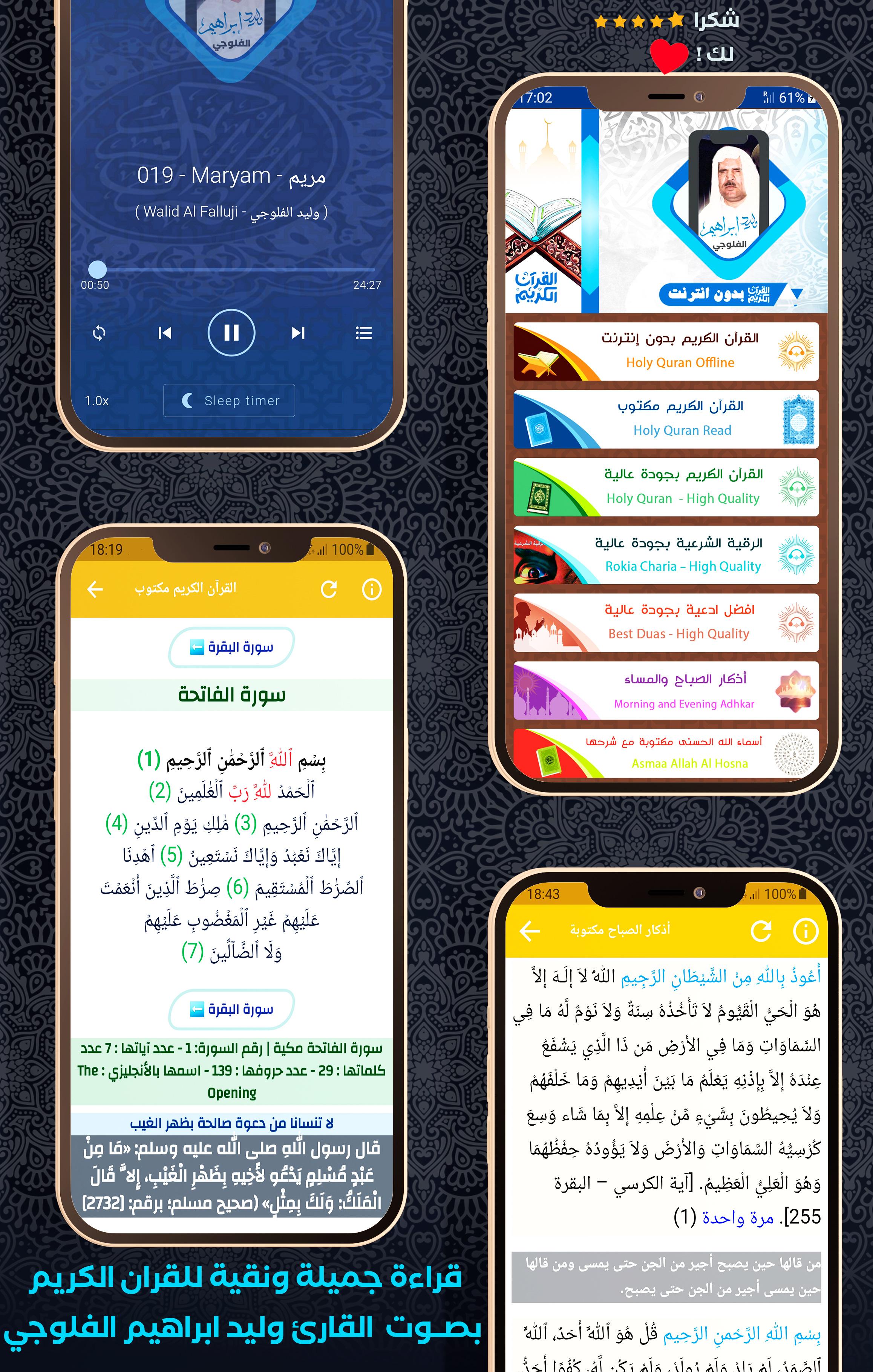 ⯌ Uygulamanın içeriği: Velid İbrahim El-Falluji'nin sesiyle ağsız Kur'an ve yazılı Kur'an-ı Kerim, sabah ve akşam hatıraları ve çok güzel dualar içerir ve ayrıca Şeriat içerir yüksek kalitede ezberler.