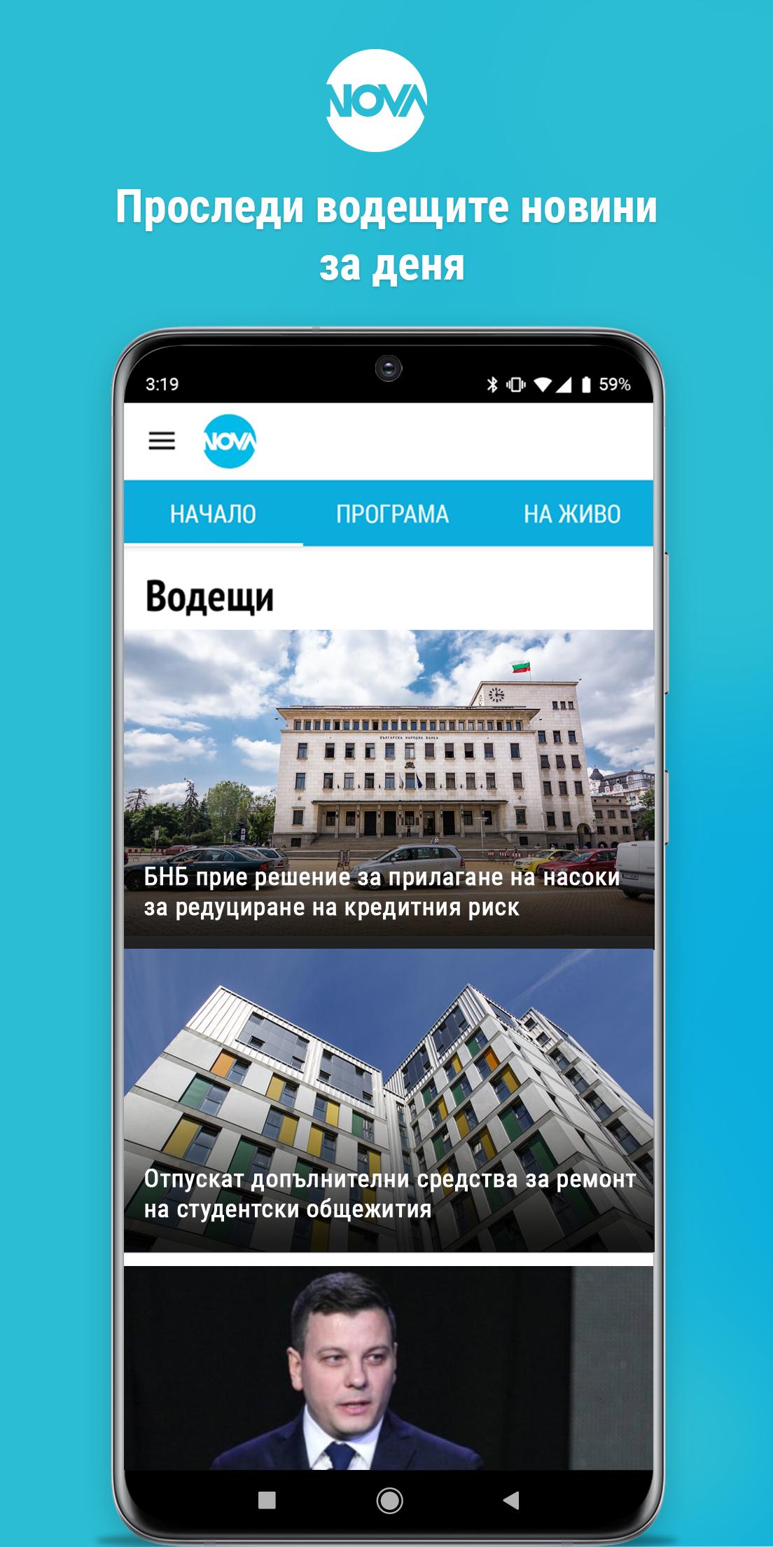 NOVA.bg'nin resmi uygulaması, kullanıcılarına Bulgaristan'dan ve dünyadan en son haberlere hızlı erişim sağlar. Push bildirimleri sayesinde günün en önemli olaylarının bildirimi sadece bir tık uzağınızda. Canlı yayın seçeneği, en sevdiğiniz programları ve dizileri mobil cihazınızda gerçek zamanlı olarak izleyebileceğiniz "Canlı" bölümündeki uygulamada mevcuttur. NOVA, KINO NOVA, DIEMA, DIEMA FAMILY kanallarının programı ve EPG formatındaki DIEMA XTRA spor paketi de her an kullanıcılar tarafından kullanılabilir.