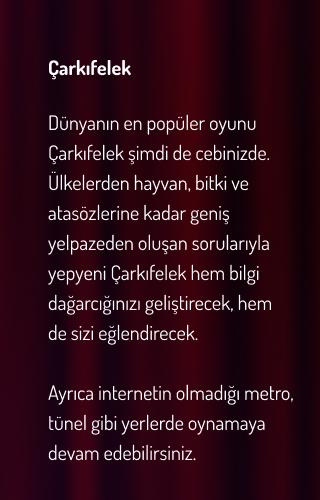 Dünyanın en popüler oyunu Çarkıfelek şimdi de cebinizde. Ülkelerden hayvan, bitki ve atasözlerine kadar geniş yelpazeden oluşan sorularıyla yepyeni Çarkıfelek hem bilgi dağarcığınızı geliştirecek, hem de sizi eğlendirecek. Ayrıca artık bilgisayara karşı farklı zorluk seviyelerindeki rakiplerle birlikte oynayabilirsiniz