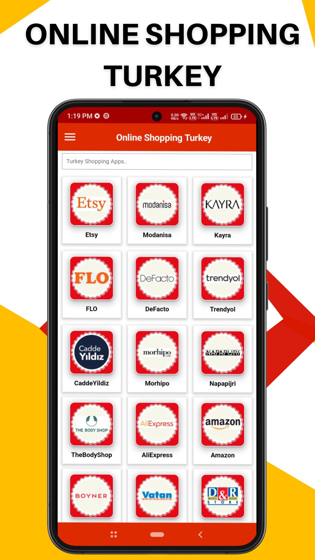 Türkiye Online Alışveriş - Online Alışveriş Türkiye Mağazaları Uygulaması, D&R Store, Hepsiburada, Boyner, Kitapyurdu, Trendyol, Amazon Morhipo, Modanisa gibi Türkiye'nin Online Alışveriş Uygulamalarının bir koleksiyonudur. ve dahası.