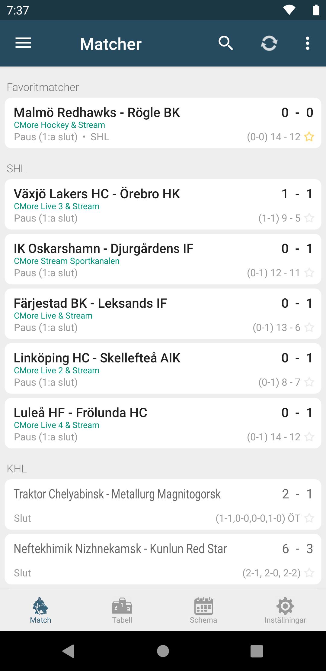 İsveç buz hokeyi SHL, HockeyAllsvenskan, HockeyEttan, SDHL, DamEttan, CHL, Hockey-VM, Hockey-OS, Dünya Kupası ve Ishockey, JVM, NHL, Schweiz Ulusal Ligi için favori takımlarınızı takip edin