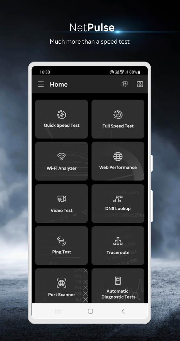 Son kullanıcının hız testi yapmasına, ağ koşullarını ölçmesine ve analiz etmesine olanak tanıyan tek dokunuş işlevi. Yükleme/indirme hızlarını, gecikmeyi ve titreşimi ölçmek için verimlilik testi çalıştırarak genel bir ağ sağlığı endeksi sağlar.