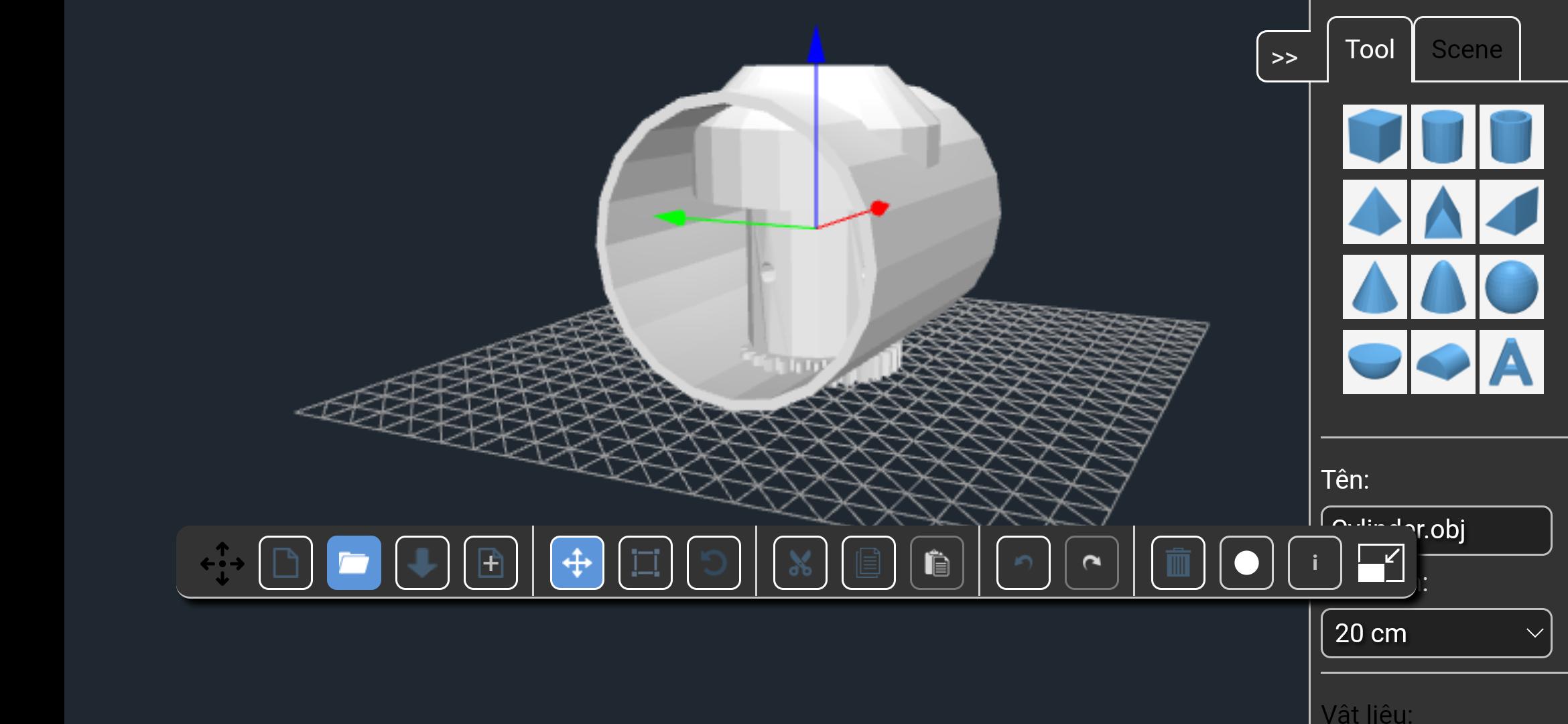 Kendi nesnenizi oluşturmak için platforma geometrik şekiller (sağ panelden) ekleyin. Ayrıca STL, OBJ ve 3DS modellerini de platforma aktarabilirsiniz. Daha sonra nesneyi STL, OBJ dosyası (3B yazdırma için) veya SCENE dosyası (daha sonra üzerinde çalışmaya devam etmek için) olarak dışa aktarın.