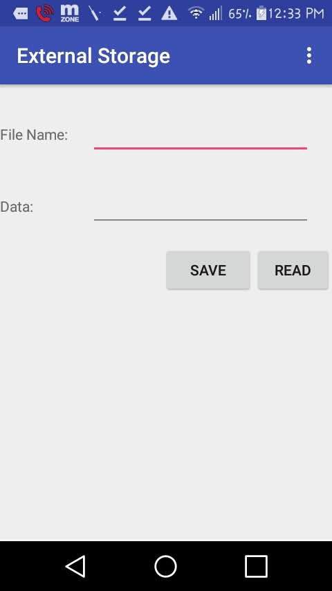 Bu uygulama ile harici depolama dosyasının veri kaydedebilir ve okuyabilirsiniz.Bu uygulama, harici depolama verileri kaydetmek ve okumak için tasarlanmıştır.