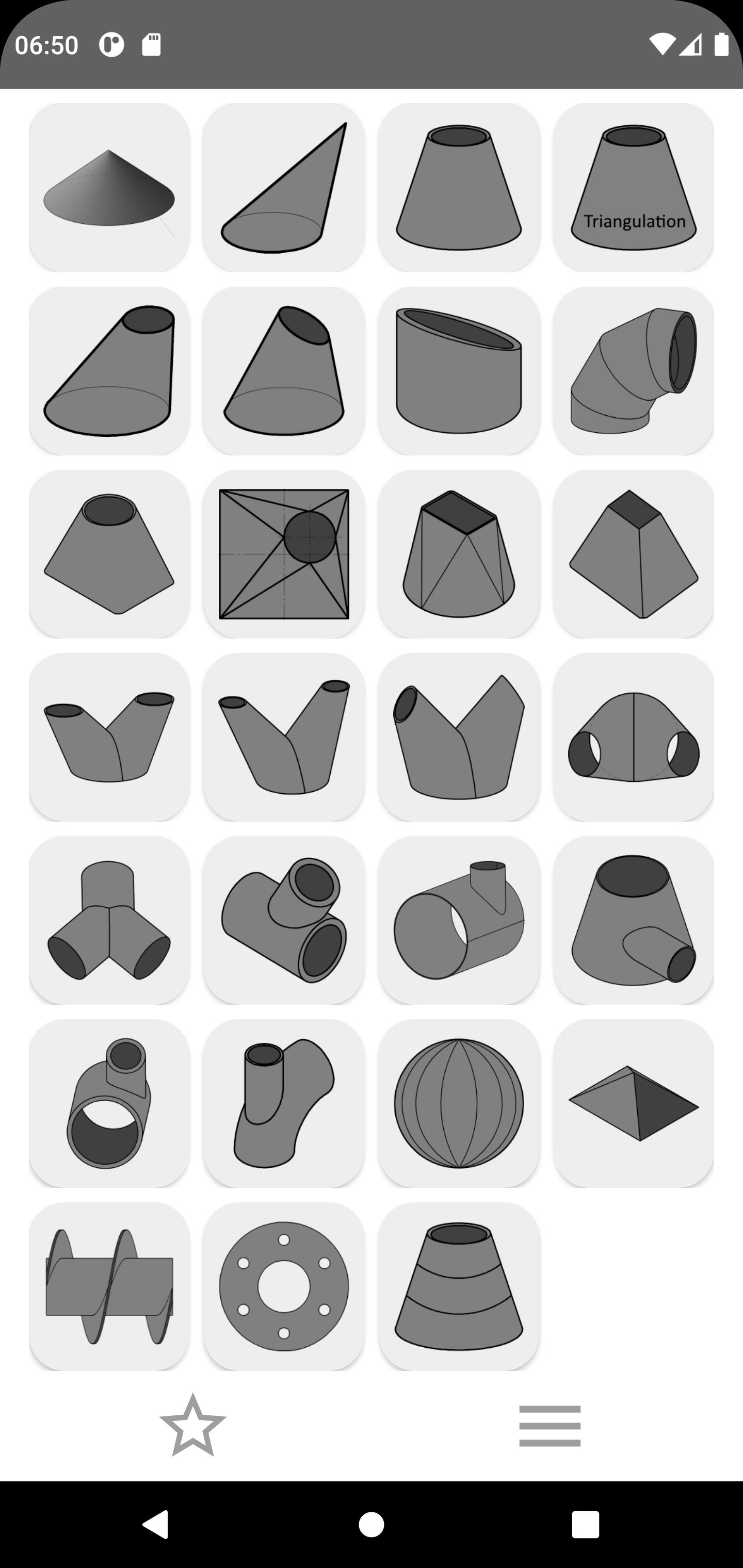 Hesap makinesi, düz model bölümlerinin inşaatı için gerekli boyutları hesaplayacaktır; ıstakoz sırtı kıvrımı, dirsek, tee parçası, kesik koni ve kesik boru, erişilebilir bir tepe noktası ve üçgenleme yöntemiyle kesik koni, Kesik Boru Düzeni veya herhangi bir açıda boru kesimi Düz Model, Boruya Eksene Dik Düz Çoğaltmada Koni Kesişimi, Yarıçap Düz Çoğaltmayla Kesilmiş Boru, Tam Koni Düzeni Düz Çoğaltma, Dikdörtgenden Yuvarlak'a veya Kareden Yuvarlak'a Geçiş düzeni Düz Çoğaltma, Yuvarlak'tan Dikdörtgen'e veya Yuvarlak'tan Kare'ye geçiş düzeni Düz Çoğaltma.