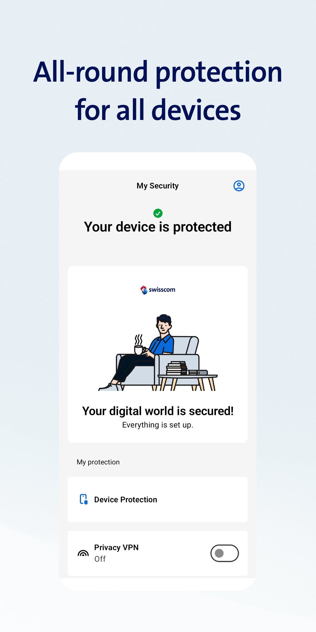 My Security for Android, Swisscom'un mavi Güvenlik ve Hizmet aboneliğinin bir parçasıdır ve Android akıllı telefonunuz ve tabletiniz için çok yönlü koruma sunar.
