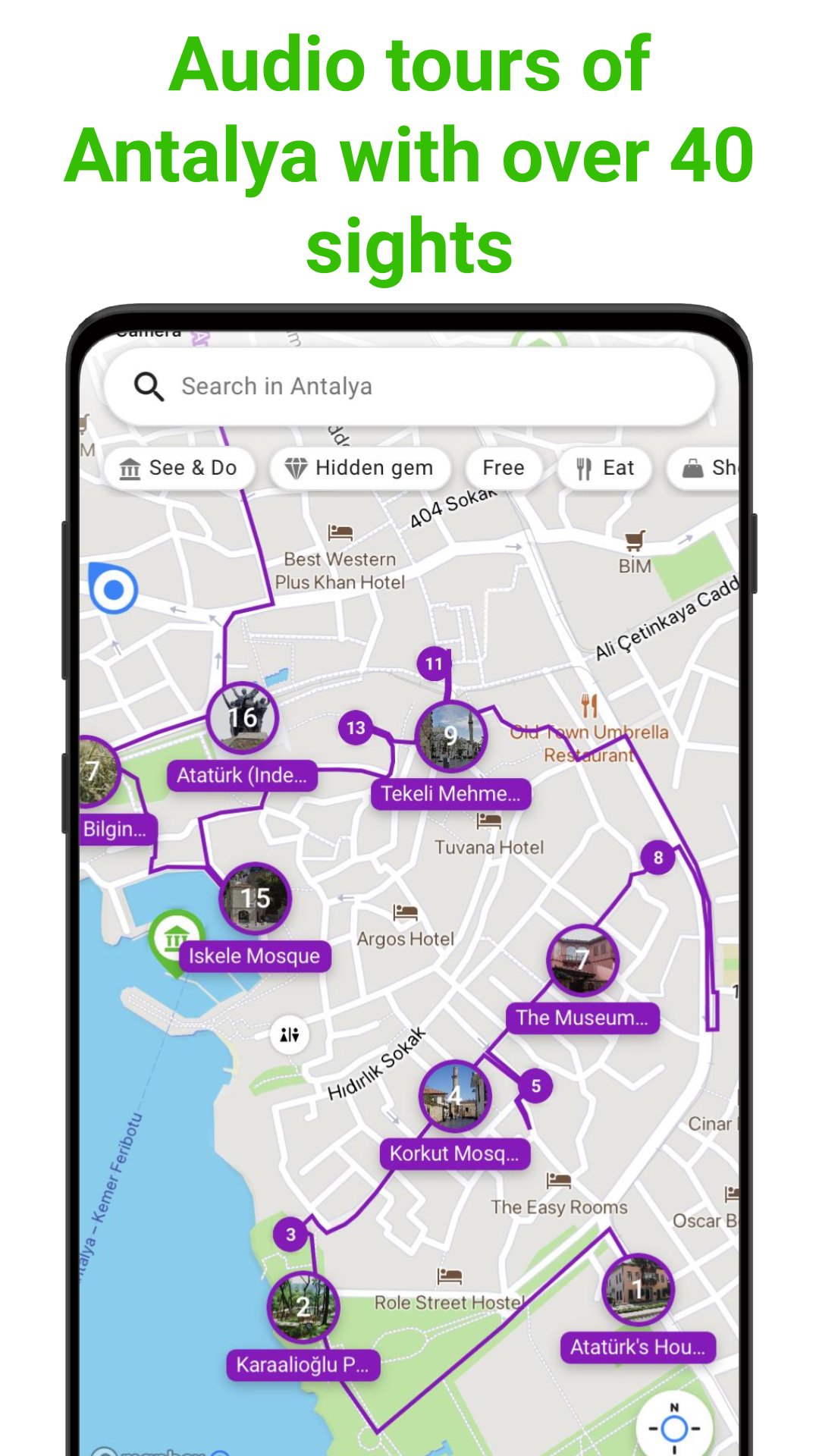 SmartGuide kaybolmanıza izin vermez ve mutlaka görülmesi gereken yerleri kaçırmazsınız. SmartGuide, Antalya'da size uygun bir şekilde kendi hızınızda rehberlik etmek için GPS navigasyonunu kullanır. Modern gezgin için gezi.