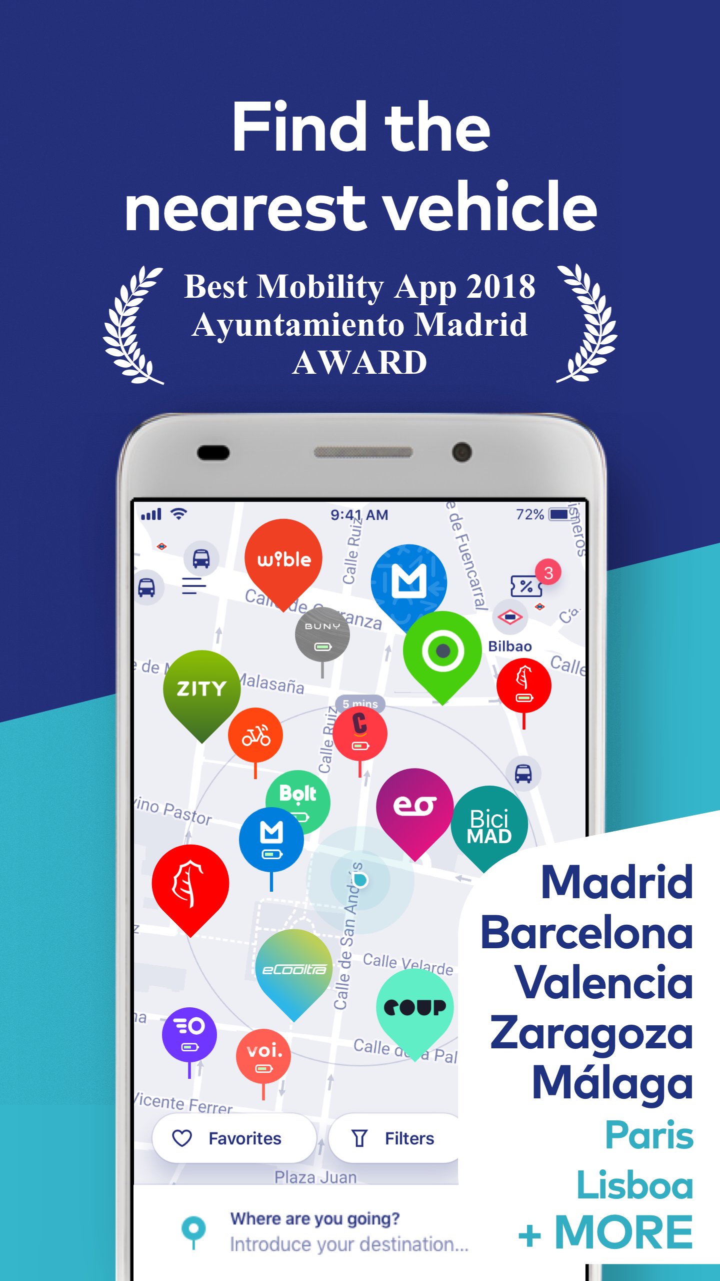 Şehrinizin tüm mobilite hizmetleri tek bir uygulamada. Uber, Cabify, taksi, Carsharing, Motosharing, bisiklet, scooter ve toplu taşıma.