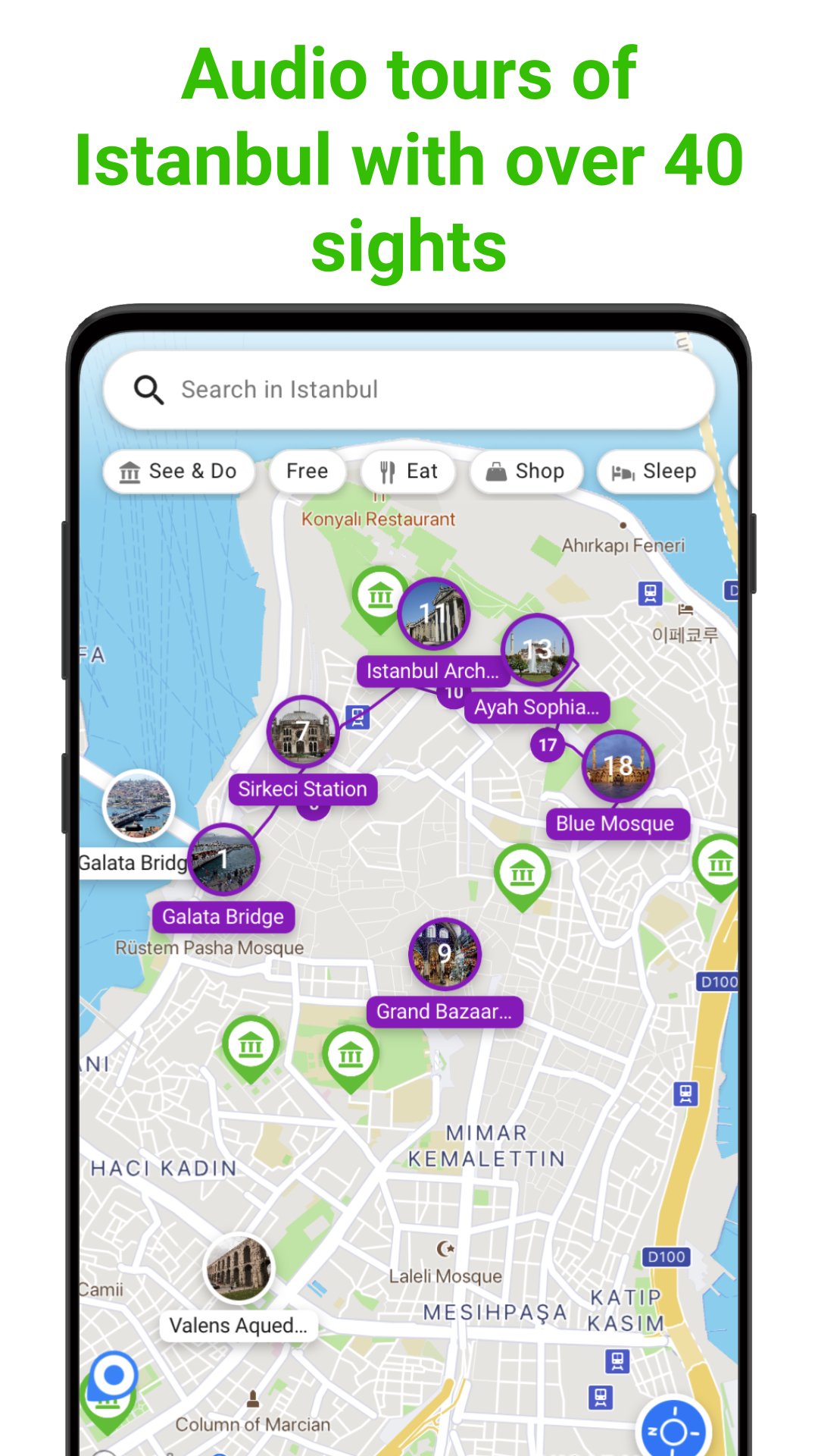 SmartGuide kaybolmanıza izin vermez ve mutlaka görülmesi gereken yerleri kaçırmazsınız. SmartGuide, İstanbul'da size uygun bir şekilde kendi hızınızda rehberlik etmek için GPS navigasyonunu kullanır. Modern gezgin için gezi.