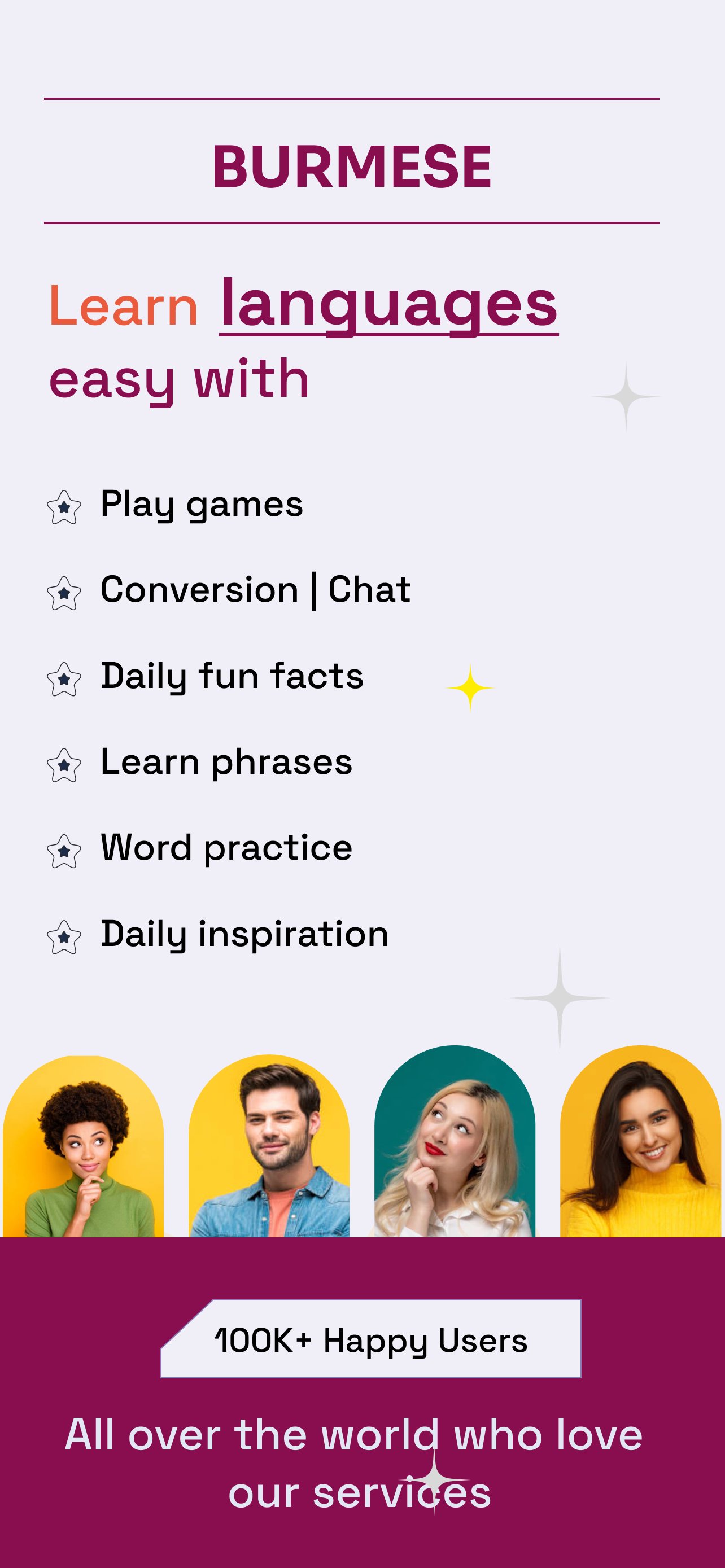 ● 獎勵功能: 勵志單字:每日緬甸語學習語言和單字的新靈感,讓您的生活對學習充滿正面的態度。