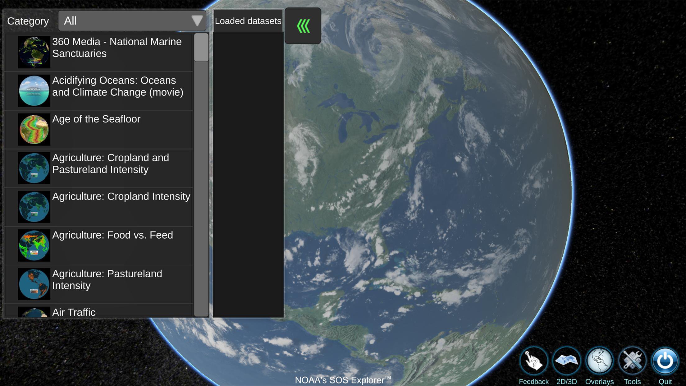 SOS Explorer (SOSx) Mobile 是流行的 NOAA Science On a Sphere (SOS) 的免費平面移動應用程序版本。這款革命性的軟件採用 SOS 數據集(通常只能在大型博物館空間的 6 英尺球體上看到),並使它們在任何地方都可以訪問、便攜和交互。 SOSx Mobile 可以讓用戶沉浸在土星環、大氣風暴、氣候變化和海洋溫度等動畫圖像中,以直觀、迷人、互動和娛樂的方式幫助解釋有時復雜的環境過程。還提供稱為 SOS Explorer 的桌面版本。