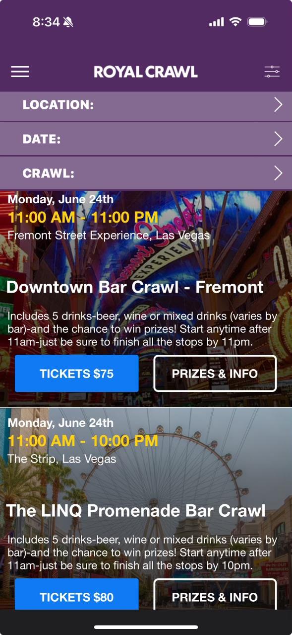 Royal Crawl 開啟了夜生活的未來!無論您是想與朋友度過一個有趣的夜晚的當地人,還是想在新城市跳酒吧的遊客,都可以使用 Royal Crawl 應用程序度過一個充滿樂趣和動感十足的夜晚。在每個酒吧簽到,兌換您的飲料,並收集一張數字撲克牌來建立您的撲克手。當晚的最佳手牌贏得獎品。非常適合生日、單身派對和私人活動。