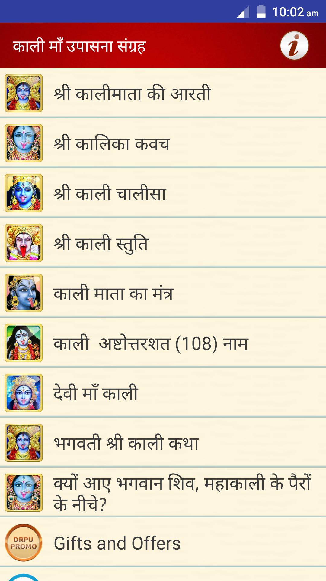 हमनेंइसएप्पमेंमाँकालीकीसभीआरतियोंकथाओंमन्त्रोंव्चालीसाआदिकोशामिलकियाहै。 माँकालीदुर्गामाँकेहीरूपमेंसेएकहैंजिनकीआराधनाबुरीशक्तिओयोंशत्रुओंऔरनज़रआदिसेबचनेकेलिएखासकरकीजातीहै。 अधिकतरसभीधार्मिककार्योंकोपूराकरनेकेमाँकालीकीपूजाकोअनिवार्यसमझाजाताहैजिसकेअंतर्गतकालीकेभजनआरतीचालीसावकथाकापाठकियाजाताहै。