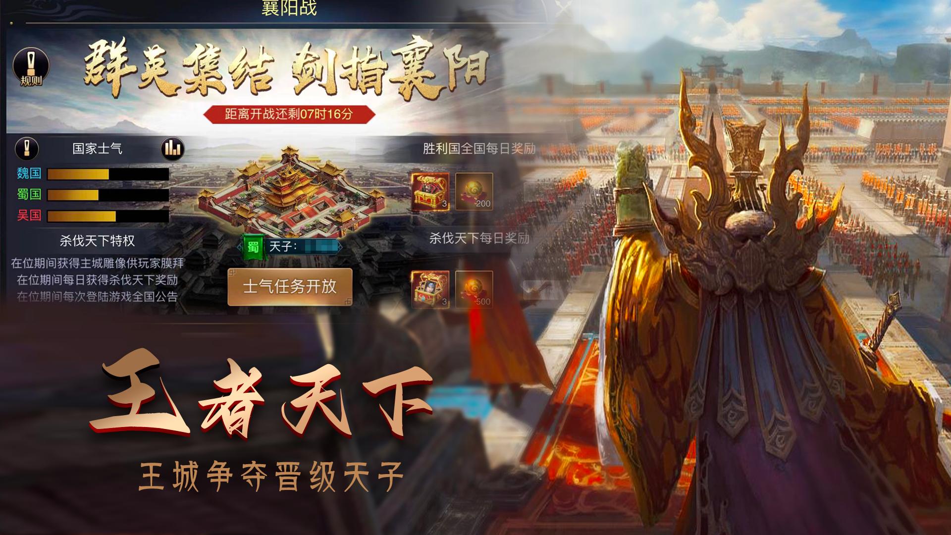 王者不畏艱險與衝突,部落榮耀與你共存,回到終極三國亂世,改變幻想與未來,追逐權力天堂的巔峯,征服最無敵的猛將,問道天下,締造屬於你自己的傳奇。是在長安洛陽雙城內做一個官老爺或大掌櫃逍遙自在,還是想成為潁上之戰的強者?皆在你一念之間。收集養成三國羣英名將,名將呂布趙雲關公,帝王曹操孫權劉備,謀士卧龍諸葛亮司馬懿,美人小喬貂蟬,享橫掃千軍無雙快樂。明日之後,暮色來臨之際,在夢幻仙境般的皇室花園內邂逅公主,遙望如緋色渲染的天空,愛如初見戀戀不忘;風雲再起之時,連結劍與江山,遠征南蠻異族,一統三國大陸。