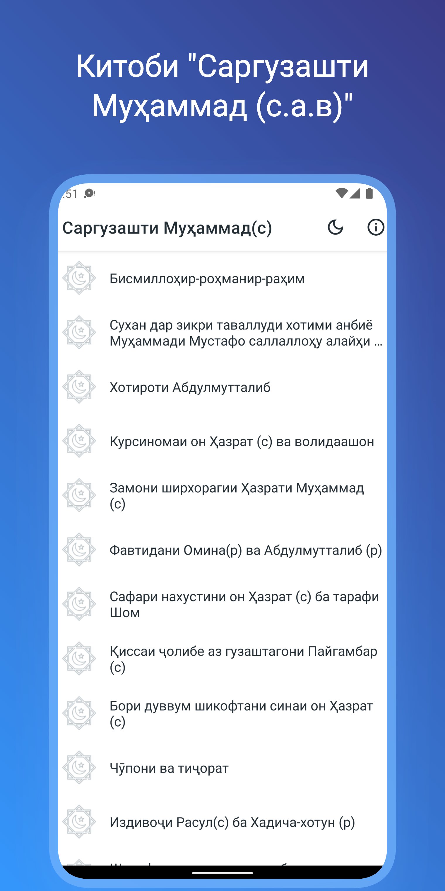 Саргузашти Муҳаммад (с), đến từ nhà phát triển Islomiy dasturlar, đang chạy trên hệ điều hành Android trong quá khứ.