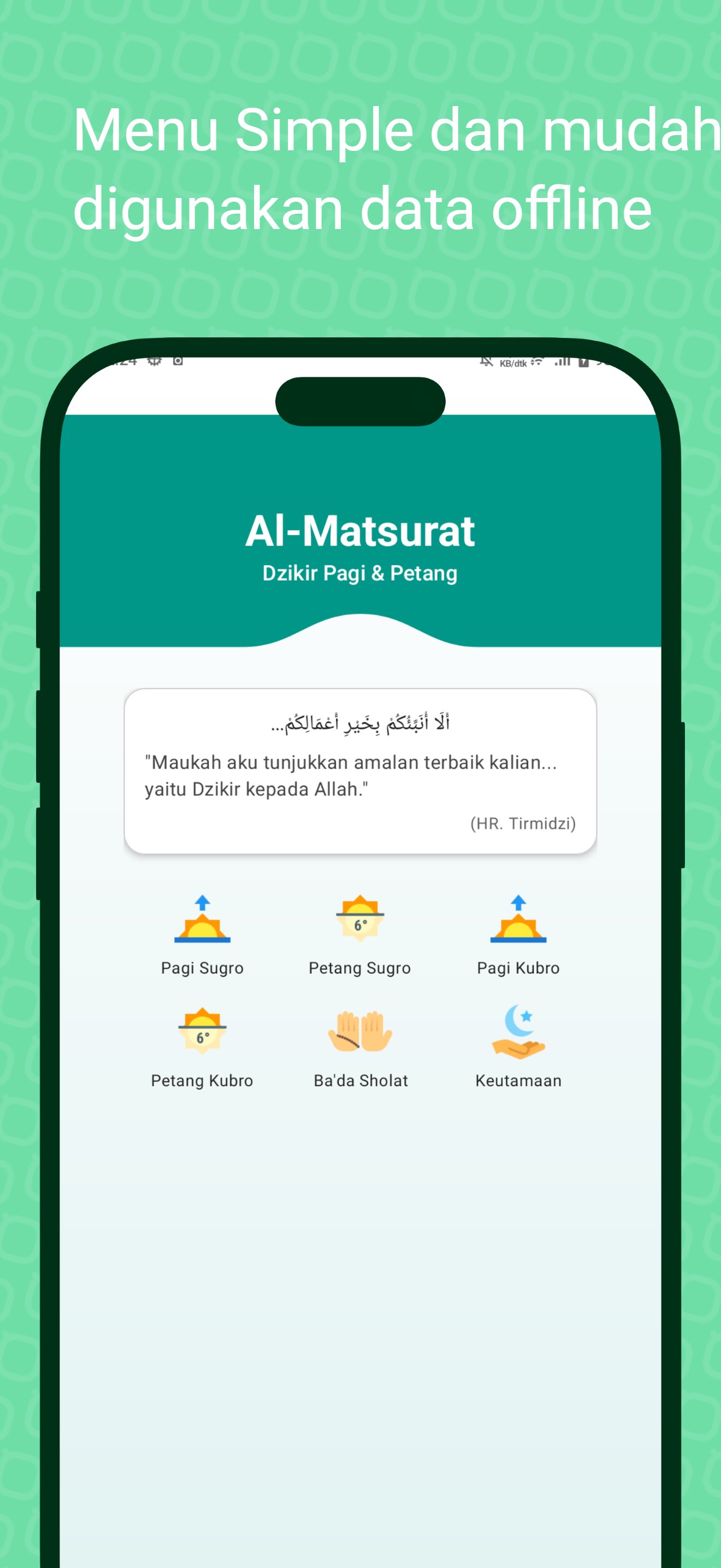 - Truy cập ngoại tuyến: Đọc và nghe Al Matsurat dhikr mọi lúc mọi nơi mà không cần kết nối internet. (Nếu được hỗ trợ)