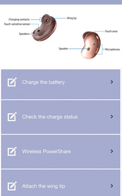 Ứng dụng này là một hướng dẫn cung cấp thông tin trực tiếp về Samsung Galaxy Buds. Từ ứng dụng này, bạn có thể tìm hiểu về cách đeo tai nghe, sạc pin thiết bị, sử dụng các tính năng của thiết bị (gọi điện, điều khiển cảm ứng, âm nhạc, v.v.), v.v.