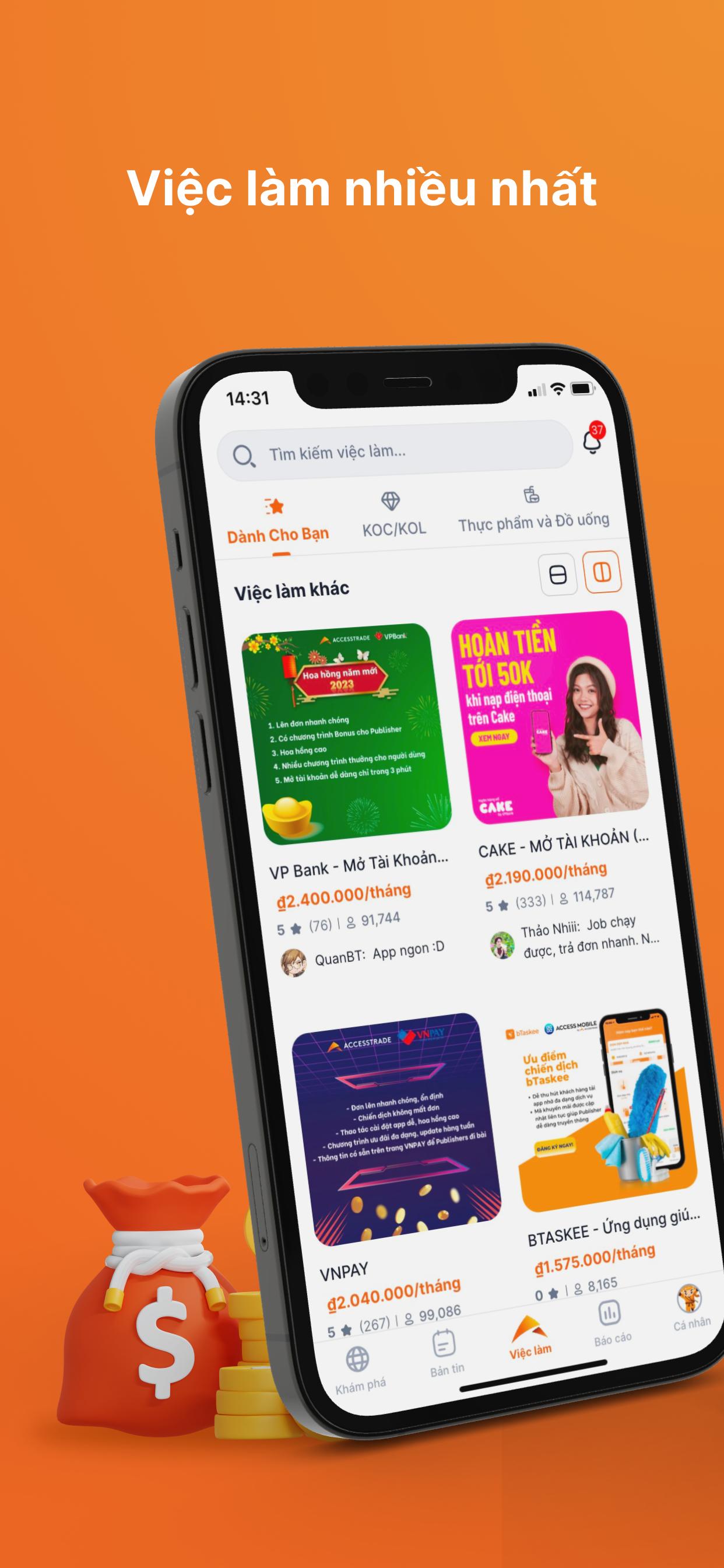 - Tải ngay app kiếm tiền ACCESSTRADE – ứng dụng kiếm tiền online dành cho mọi người. Dù bạn là ai, chỉ cần bạn có quyết tâm, bạn sẽ có thu nhập bền vững mỗi ngày thông qua affiliate marketing.