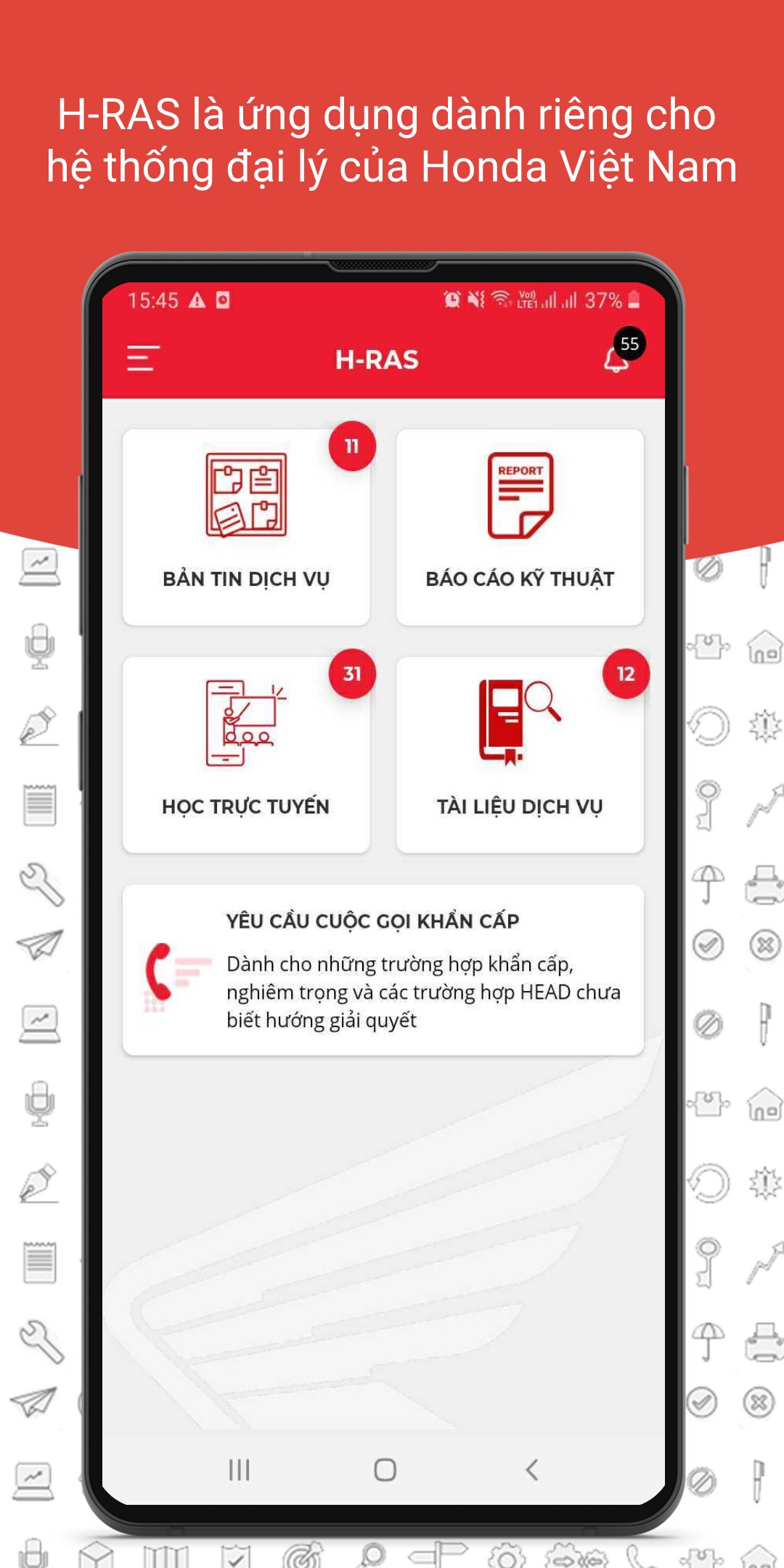H-RAS là ứng dụng dành riêng cho hệ thống đại lý của Honda Việt Nam, hỗ trợ kỹ thuật, giải quyết khiếu nại khách hàng, đăng ký chứng nhận bảo hành, hỗ trợ tự học và hoạt động OJT hàng tháng.