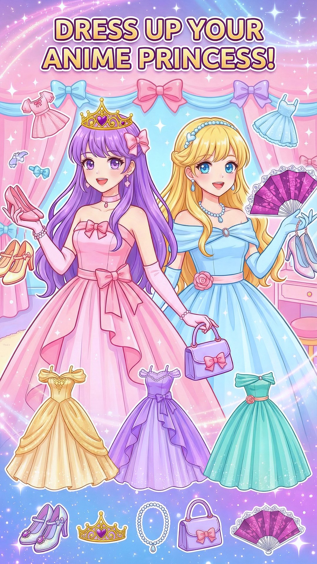 Trong Trò chơi công chúa cho trẻ em gái, bạn có thể tạo nhân vật châu Á đáng yêu với nhiều trang phục và kiểu tóc khác nhau, vui chơi trong trò chơi hóa trang anime! Trò chơi con gái với công chúa dễ thương nhất từ trước đến nay!