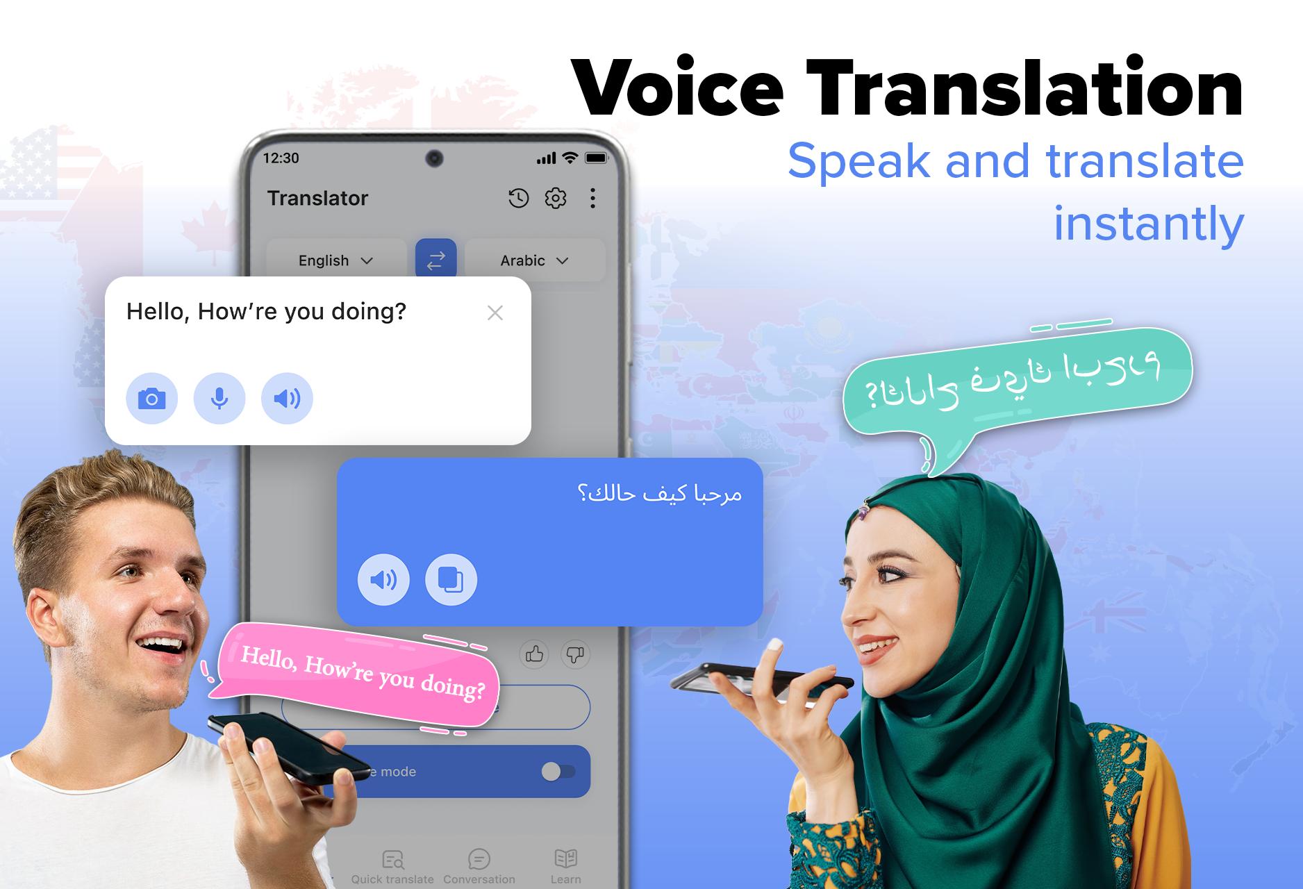 ✔ Fast, and easy translations between the following languages are supported: translate English to Hindi, Tagalog, Spanish, Arabic, Japanese, Korean, Chinese, German, French, Italian, Dutch, etc. The Translator app has +100 languages for your daily translate needs.